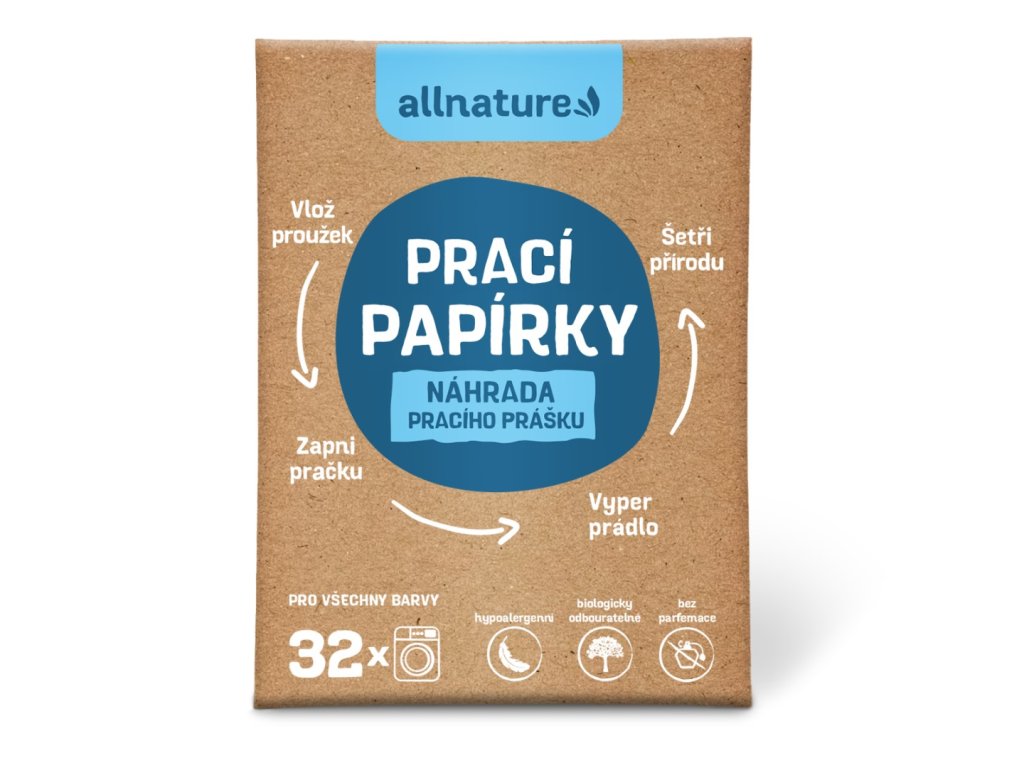 Allnature prací papírek je moderní alternativou ke klasickým pracím práškům, kapslím i gelům. Je mimořádně kompaktní, lehký a díky tomu, že se nemůže vysypat ani rozlít, je ideální volbou na cesty. Bez obav si ho můžete vzít i na palubu letadla. Prací papírek Allnature se během pár vteřin rozpustí na gel a účinně vypere všechny druhy i barvy prádla. Lze jej snadno kombinovat s avivážemi, pracími parfémy nebo jinými máchadly a změkčovadly pro ještě lepší výsledek.
