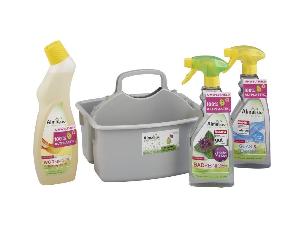 ALMAWIN Jubilejní set Praktický box obsahuje 3 výrobky pro snadný úklid a 3 vzorečky.ALMAWIN Čistič na koupelny 500 ml S obsahem glycerínu a kukuřičných proteinů, které chrání pokožku rukou. Eukalyptový olej dodá příjemnou, svěží vůni. Dermatologicky testováno. Použití: Používejte neředěný. Rovnoměrně naneste na čištěnou plochu a podle intenzity znečištění nechte působit (asi 1-5 minut), potom spláchněte a umyjte. Spáry mezi dlaždicemi před použitím navlhčete. Otestujte snášenlivost materiálu na skrytém místě. Nepoužívejte na mramor, vápenec nebo povrchy málo odolné vůči kyselinám. Používejte ochranné rukavice.ALMAWIN WC Citrón 750 ml Účinně rozpouští mastnotu, špínu a vápenné usazeniny a udržuje WC hygienicky čisté. Speciální, zhuštěná konzistence zaručí, že se přípravek dostane i do nedostupných míst. S příjemnou vůní citronu. Použití: Aplikujte na čištěný povrch, nechte působit, vydrhněte štětkou a spláchněte. Používejte neředěný. ALMAWIN Čistič na okna a skleněné povrchy 500 ml Spolehlivě čistí všechny skleněné a plastové povrchy, skvěle leští, rychle schne a nezanechává šmouhy. Je vhodný pro všechny povrchy, které odolávají vodě - zrcadla, okna, skleněné tabule a stoly, televizní a počítačové monitory, lakovaný a plastový nábytek, obkládačky, konzoly vozidel, autoskla. Lze jej použít i do ostřikovačů autoskel. Není vhodný pro plazmové obrazovky. Použití: Nastříkejte na znečištěnou plochu, očistěte a vytřete do sucha. Při rozstřikování držte nádobku ve vzdálenosti 40 cm od čištěné plochy. Lze ředit vodou. ALMAWIN Tekutý prací prostř. Sport + Outdoor 45 ml: Ekologicky vypere všechny nečistoty. Účinně odstraňuje stopy potu. Při praní zachovává funkčnost membránových tkanin (jejich prodyšnost a funkčnost). Při praní zachovává účinnost a kvalitu moderních materiálů jako jsou speciální vlákna, mikrovlákna, plavecké oblečení, membránové tkaniny apod. Jak funguje nový AlmaWin Sport + Outdoor? Pracího účinku a tím i ochrany speciálních tkanin je dosaženo jedinečným složením. AlmaWin Sport + Outdoor obsahuje čisté cukerné tenzidy (vyrobené z brambor, kukuřice a cukrové třtiny a cukrové řepy), sulfáty z rostlinných olejů, směs solných kyselin a kyselinu citronovou ke změkčení vody a zlepšení pracího efektu. Neobsahuje mýdlo, které by mohlo narušit ochranné membrány a vlákna. Pro desinfekci a vůni je přidán BIO levandulový éterický olej. Účinný při teplotách 20°, 30° a 40°C. ALMAWIN Tekutý prací prostř.na tmavé černé 45 ml: Díky svému šetrnému složení chrání strukturu vláken i sytost barev, takže vaše prádlo zůstane dlouho jako nové. Obsahuje zjemňující pšeničný protein a výtažek z mýdlových ořechů, který prostředku propůjčují tmavší barvu. Přírodní esenciální oleje z verbeny a eukalyptu vaše prádlo příjemně provoní čistotou a svěžestí. Prostředek je vhodný na přírodní, smíšené i syntetické tkaniny při teplotách 20-60°C. Nezatěžuje životní prostředí, je 100% odbouratelný. K výrobě obalu bylo z 95 % použito recyklovaného plastu. Pro přírodní, smíšené a syntetické tkaniny při teplotách 20-60°.ALMAWIN Tekutý prací prostředek 65 ml: Šetrný prací prostředek na bílé i barevné prádlo. S obsahem změkčujících látek pro hedvábnou jemnost vašeho prádla a příjemnou, delikátní vůní přírodních éterických olejů. Pšeničné proteiny navíc pečují o pokožku rukou. Účinný při teplotách od 30°C do 95°C. Vhodné do pračky i na ruční praní. Bez fosfátů, plniv a konzervačních prostředků. Nevhodné na vlnu a hedvábí.<h2>Složení </H2><br /><P><STRONG>ALMAWIN Čistič na koupelny 500 ml:</STRONG> <5% nichtionische Tenside (Zuckertenside), Duftstoffe (etherisches Pfefferminzöl*), *aus kontrolliert biologischem Anbau. Weitere Inhaltsstoffe: Wasser, Milchsäure, Citronensäure, pflanzliche Fettsäureglyceride. 100% der Inhaltsstoffe sind natürlichen Ursprungs. </P><br /><P><STRONG>ALMAWIN WC Citrón 750 ml:</STRONG> <5% non ionic surfactants (saccharoidal surfactants), anionic surfactants (vegetable fatty alcohol sulphates), parfume (natural essential oil of lemongras*), Citral. *certified organic. Further Složení: water, lactic acid, sodium citrate, xanthan Gum, citric acid. 100 % of the total of the Složení are from natural origin.</P><br /><P><STRONG>ALMAWIN Čistič na okna a skleněné povrchy 500 ml:</STRONG> <5 % neiontových povrchově aktivních látek (povrchově aktivní látky na bázi rostlinných cukrů). Další složky: Voda, etanol (rostlinný alkohol), kyselina mléčná. 100 % složek je přírodního původu. HODNOTA PH: 5,0 - 8,0</P><br /><P><STRONG>ALMAWIN Tekutý prací prostř. Sport + Outdoor 45 ml: </STRONG>> = 5% <15% neiontové povrchově aktivní látky (cukrové povrchově aktivní látky), aniontové povrchově aktivní látky (sírany mastných alkoholů), <5% vůně (levandulový olej), linalool. Další složky: voda, ethanol, sodné soli kyseliny jantarové a polyasparagové, kyselina citrónová, ricinoleát zinečnatý, kyselina mléčná. Může způsobit alergické reakce. 96% složek je přírodního původu. Obsahuje linalool. HODNOTA PH: 5,5 - 8</P><br /><P><STRONG>ALMAWIN Tekutý prací prostř.na tmavé černé 45 ml:</STRONG> <5% neiontové povrchově aktivní látky, aniontové povrchové aktivní látky (rostlinné Sulfáty mastných alkoholů), mýdlo z rostlinného oleje*, vonné látky (éterické oleje, verbena a eukaliptus*), limonen, citral, geraniol, linalool, citronellol. Další složky: voda, sodná sůl kyseliny citrónové, ethanol, extrakt z mýdlových ořechů, kyselina mléčná, polysacharid, pšeničné proteiny, kyselina citrónová. * Z kontrolovan