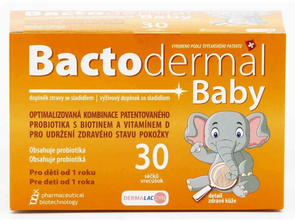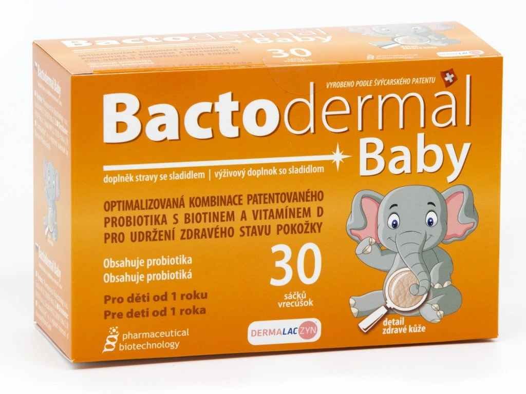 Bactodermal baby je doplněk stravy obsahující kombinaci důležitého patentovaného probiotika s vitamíny. Bactodermal baby je zaměřený na harmonizaci fyziologických procesů, pro správnou funkci imunitního systému a tím i zdraví pokožky během vývoje dětí a podporu správné funkce kožní imunity. Péče o atopickou pokožku začíná ve střevě.