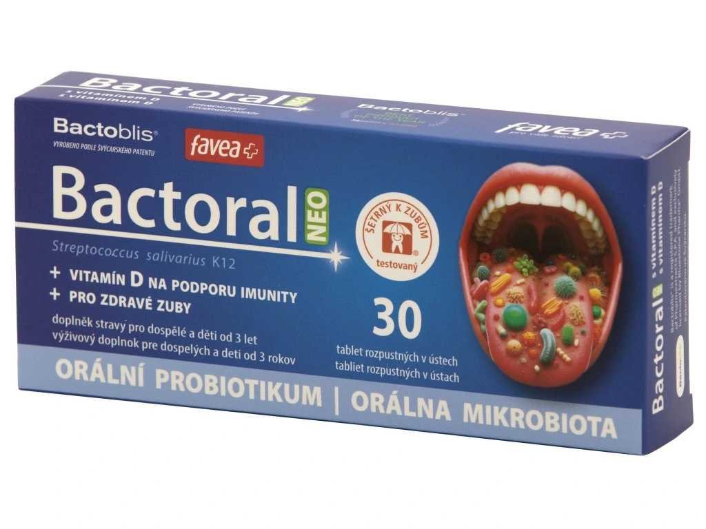 První orální probiotikum pro doplnění přátelské mikrobioty krku a dutiny ústní. Obsahuje probiotickou kulturu Streptococcus salivarius K12, která tvoří peptidy salivaricin A2 a salivaricin B tzv. bakteriociny. Tato bakterie dokáže zaujmout strategické pozice v dutině ústní, nosohltanu a středouší a dokáže vytěsnit nežádoucí druhy. Studie dokazují, že Bactoral je schopen kolonizovat dutinu ústní a horní část dýchacích cest již 3 dny po prvním podání a udrží se na nich ještě 32 dní po vysazení. Vitamín D přispívá k normální funkci imunitního systému a normálnímu stavu zubů.