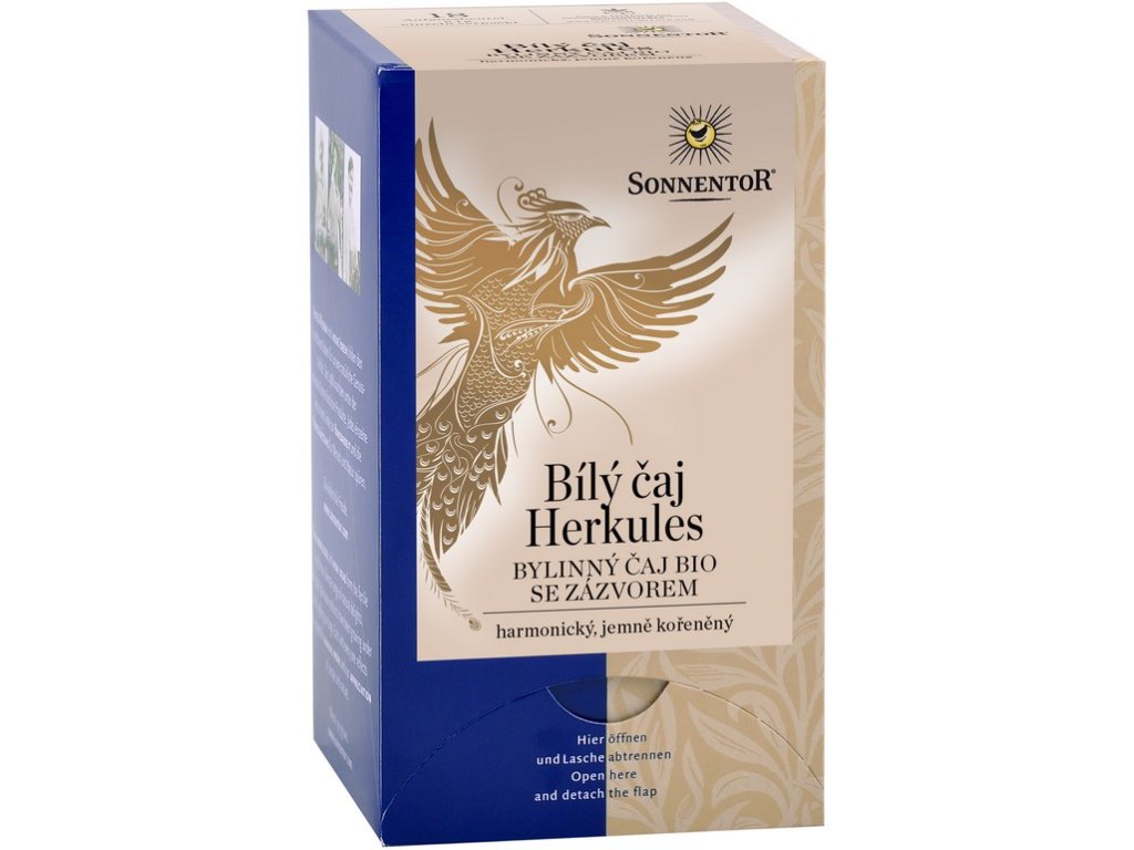 Vedle tradičního Pai Mu Tanu existují také směsi s bílým čajem, které stojí za to. Luxusní čajové lístky se v SONNENTORU smíchaly se zázvorem a vznikl tak „Čaj Herkules – tvůrce síly.“ Cenný bílý čaj smíchaný s energií nabitým zázvorem a završen citronovou trávou, skořicí a kardamonem.Složení: bílý čaj bio (obsahuje kofein) 39%, zázvor kousky19% bio, citronová tráva bio, pomerančová kůra bio, skořice Cejlon bio, kardamon bio, chrpa květ bio, slunečnice květ bio, lékořice bio