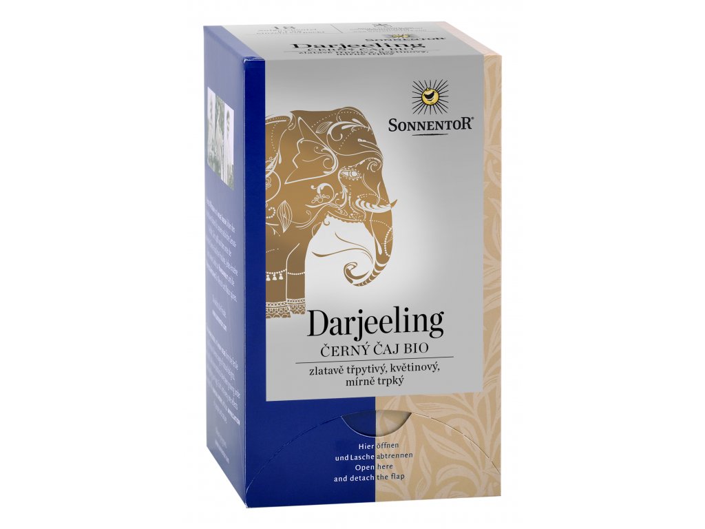 >Černý čaj Darjeeling – „Šampaňské všech čajů.“ Pěstitelská oblast Darjeeling leží na jižních svazích Himalájí. Pro černý čaj Darjeeling je charakteristická jeho obzvláště květinově aromatická a půvabně jemná chuť. K dostání také sypaný. Příprava černého čaje je malým uměním a měla by být denně oslavována. Návod k přípravě: čajový sáček na šálek (cca 250 ml), přelejte vroucí vodou a nechte 2-5 min. luhovat. luhování 2 min.: osvěžuje luhování do 5 min.: uklidňuje Skladovat v suchu a chladu.Složení: 100% černý čaj Darjeeling bio (obsahuje kofein)