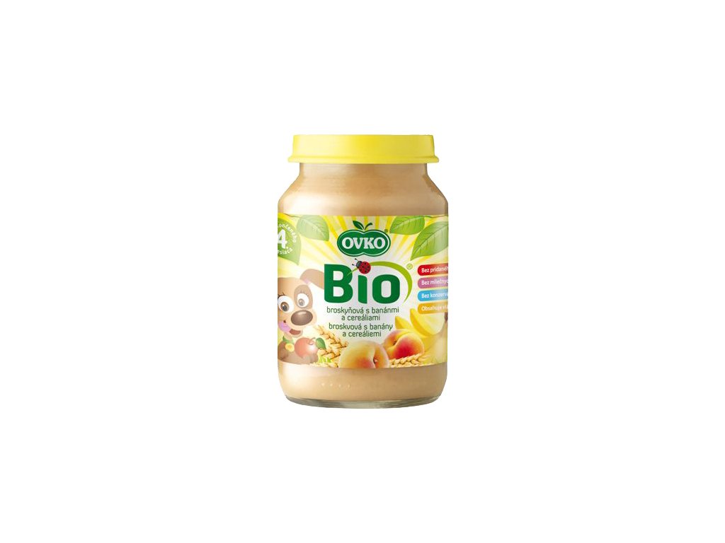 Bio broskvová s banány a cereáliemi Ovocno-obilný příkrm z broskví a banánů s ovesnými vločkami okyselený citrónovou šťávou, bez přidaného cukru a konzervantů. Od ukončeného 4. měsíce.