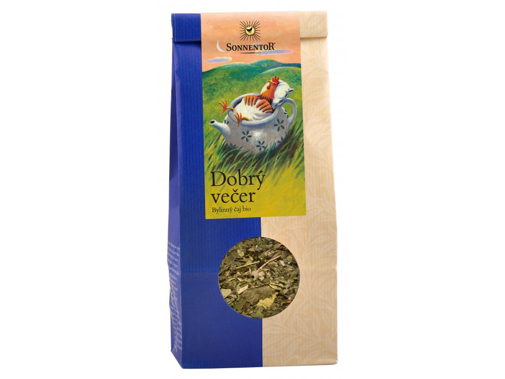 Bio bylinný čaj Dobrý večer – „šíří příjemnou útulnost“. Abyste si odpočinuli od ruchu všedního dne a strávili klidnou noc, pomáhá někdy strávit večer klidně. Čaj Dobrý večer od Sonnentoru je harmonickou bylinnou směsí speciálně vytvořenou pro příjemné večery. Vedle meduňky obsahuje také list maliny a sléz. Čaj je nejlépe pít jednu hodinu před ulehnutím.Složení: Meduňka bio, jablka bio, malina list bio, sléz bio, sedmikráska bio Návod k přípravě: Čajovou lžičku na šálek (cca 200ml), přelejte vroucí vodou a nechte 5-10 min. luhovat. Skladovat v suchu a chladu.