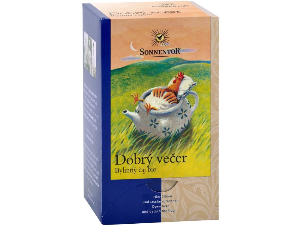 Dobrý večer bio porc. dárkový 24g Abyste si odpočinuli od ruchu všedního dne a strávili klidnou noc, prožijte klidně celý večer. Čaj Dobrý večer od Sonnentoru přitom pomáhá „vypnout“ a dobře usnout. Vedle uklidňující meduňky obsahuje tato čajová směs také list ostružiny a sléz. Čaj je nejlepší pít jednu hodinu před ulehnutím. Návod k přípravě: čajový sáček na šálek (cca 250ml), přelejte vroucí vodou a nechte 5-10 min. luhovat. Skladovat v suchu a chladu.Složení: meduňka bio, ostružina list bio, šípek oplodí bio, sléz bio