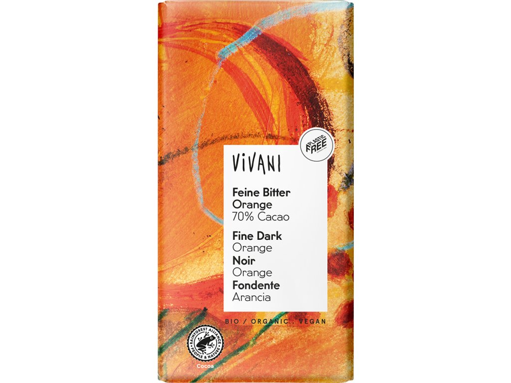 Bio hořká čokoláda s pomerančem 70% Jemná hořká čokoláda s vysokým obsahem kakaa ovoněná pomerančovou silicí a oslazená přírodním třtinovým cukrem. Neobsahuje sójový lecitin ani žádný jiný emulgátor a je vhodná pro vegany. Tato čokoláda vyhrála stříbrné ocenění v roce 2006 při hodnocení provedeném Německou zemědělskou společností (DLG). Čokoláda s tradicí: Čokolády značky VIVANI jsou vyráběny německou rodinnou firmou Ludwiga Weinricha. Rodina vyrábí čokolády již déle než jedno století. Tradice a zkušenost spolu s nejlepšími bio surovinami, moderním vybavením a pečlivou kontrolou jsou zárukou vysoké kvality.