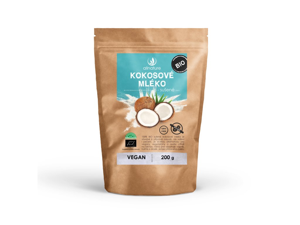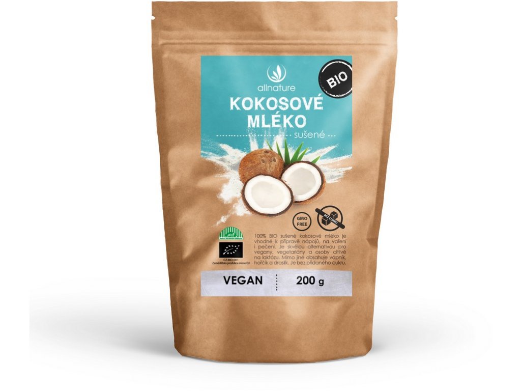 100% BIO sušené kokosové mléko od značky Allnature se hodí pro přípravu nápojů, vaření i pečení. Je vhodnou alternativou pro osoby citlivé na laktózu, vegany i vegetariány. Mimo jiné obsahuje vápník, draslík a hořčík. Neobsahuje žádný přidaný cukr.