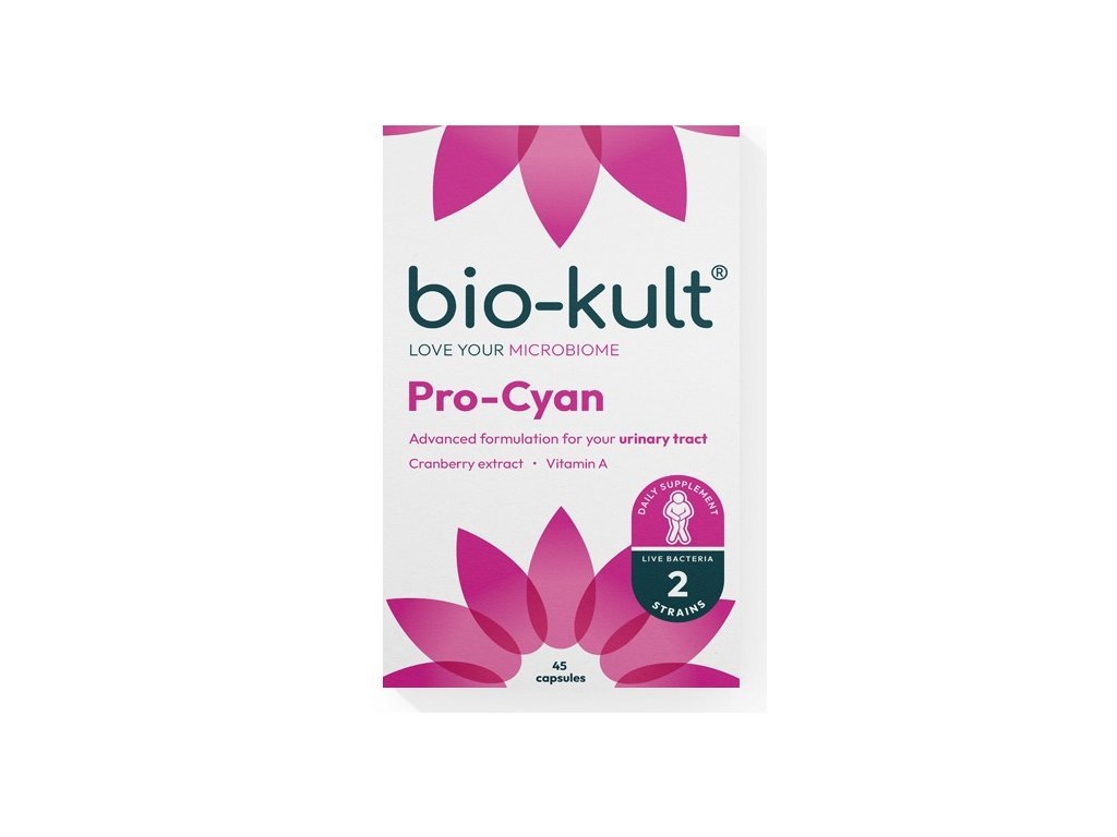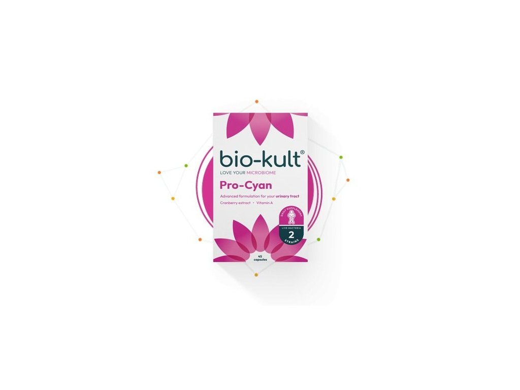 Bio-Kult Pro-Cyan je moderní probiotická formule s trojím účinkem. Dva speciálně vybrané, patentově chráněné, kmeny živých kultur s extrakty z klikvy - kanadských brusinek a vitamínu A. Obsah extraktu z kanadských brusinek v jednom balení výrobku je ekvivalentem 380 g čerstvých brusinek! Vitamin A přispívá k normální funkci imunitního systému a udržování sliznice, tedy i sliznice močového ústrojí.