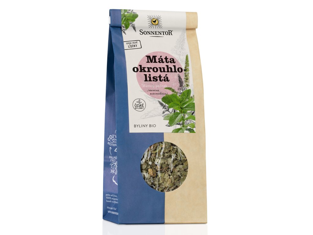 Máta okrouhlolistá bio syp. 50g od výrobce Sonnentor. Produkt v bio kvalitě. Pěstováno metodou ekologického zemědělství. Máta okrouhlolistá je výrazně jemnější než máta peprná díky nižšímu obsahu mentolu. K jemné mátové ovocné chuti tohoto čaje, který je výborný teplý i studený, se také hodí sladký dezert. TIP: smíchejte mátu s meduňkou a získáte vynikající směs. Návod k přípravě: čajovou lžičku na šálek (cca 200 ml) přelejte vroucí vodou a nechte 5-10 min. luhovat. Máta okrouhlolistá bio Skladovat v suchu a chladu. Tento produkt neobsahuje žádné alergeny.Doplňkové parametry