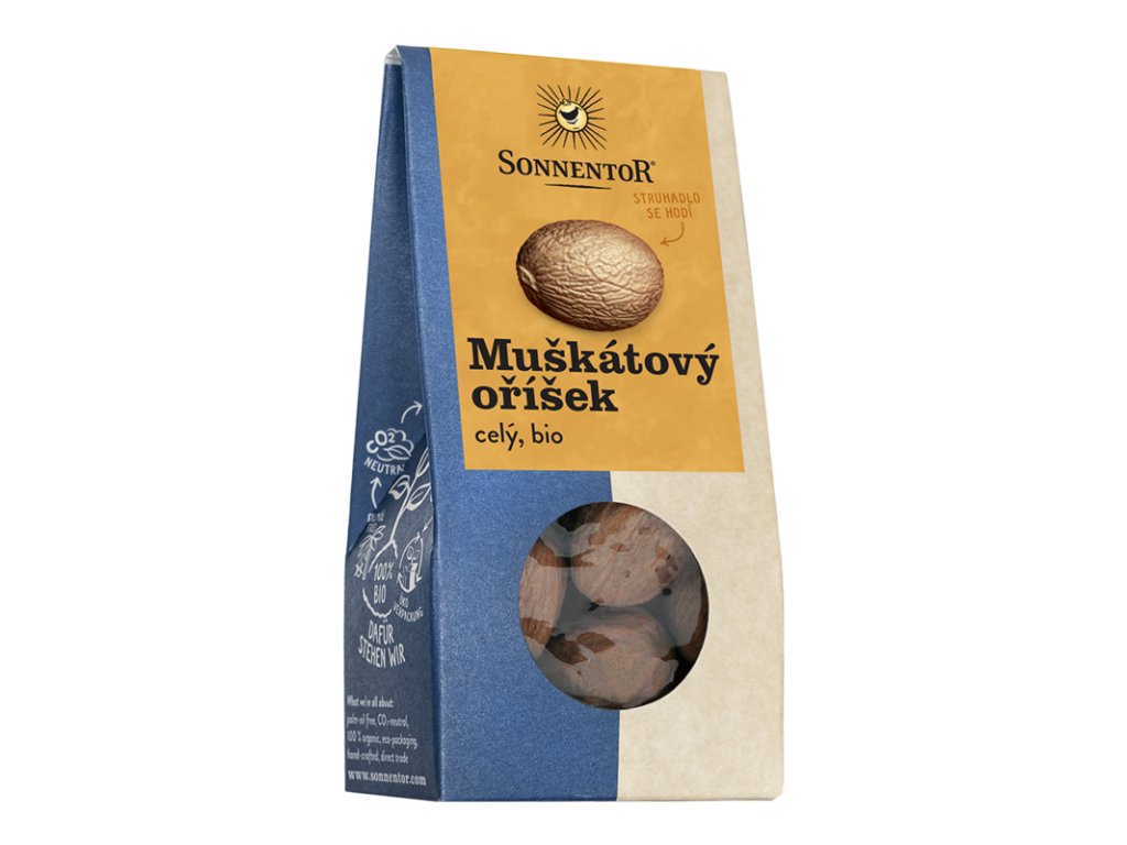 Muškátový oříšek bio, celý 25g od výrobce Sonnentor. Produkt v bio kvalitě. Pěstováno metodou ekologického zemědělství. Muškát není botanicky vzato ořech, nýbrž jádro broskvového ovoce. Muškát má jemnou aromatickou vůni a trošku pálivou, silně kořeněnou, teplou chuť. Koření plné síly je ideální do polévek, omáček, zeleniny a sýrového fondue. Výborně se hodí do bramborových pokrmů jako je např. bramborová kaše, bramborová polévka, krokety atd. Lze jej použít i do sladkých jídel. TIP: Pozor, stačí špetka na dostatečné dochucení a zjemnění pokrmů. Muškátový oříšek bio Skladovat v suchu a chladu. Tento produkt neobsahuje žádné alergeny.Doplňkové parametry