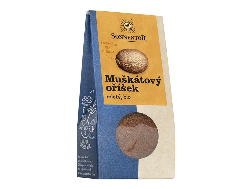 Muškátový oříšek bio, mletý 30g od výrobce Sonnentor. Produkt v bio kvalitě. Pěstováno metodou ekologického zemědělství. Muškát není botanicky vzato ořech, nýbrž jádro broskvového ovoce. Muškát má jemnou aromatickou vůni a trošku pálivou, silně kořeněnou, teplou chuť. Koření plné síly je ideální do polévek, omáček, zeleniny a sýrového fondue. Výborně se hodí do bramborových pokrmů jako je např. bramborová kaše, bramborová polévka, krokety atd. Lze jej použít i do sladkých jídel. TIP: Pozor, stačí špetka na dostatečné dochucení a zjemnění pokrmů. Muškátový oříšek bio, mletý Skladovat v suchu a chladu. Tento produkt neobsahuje žádné alergeny.Doplňkové parametry