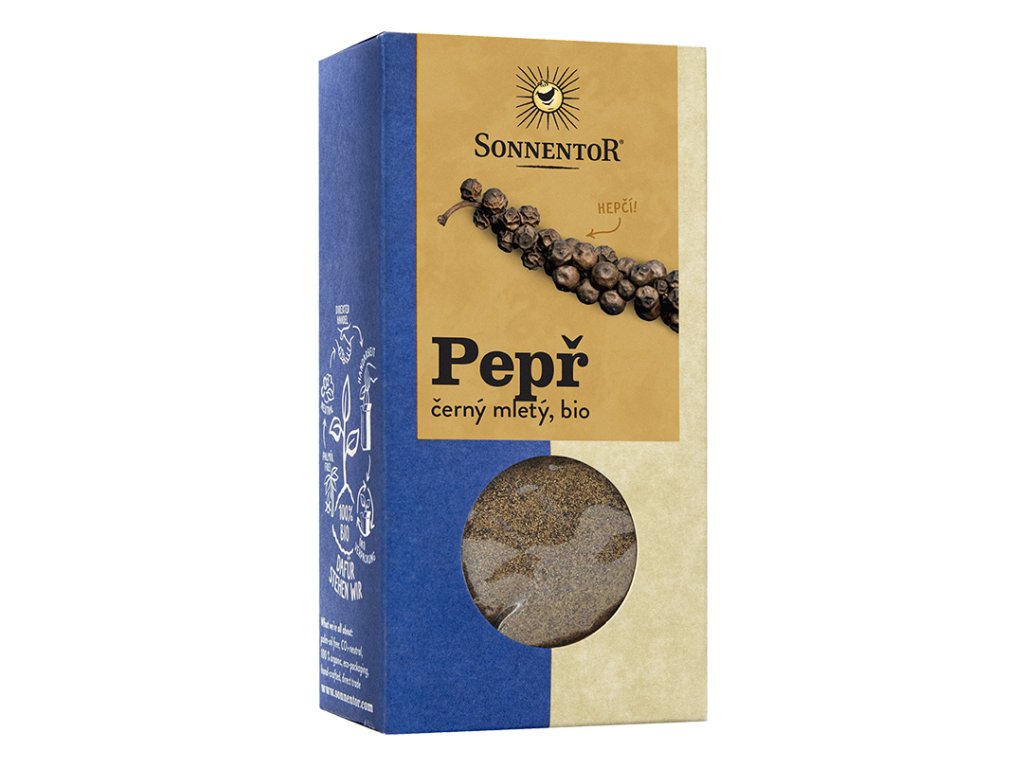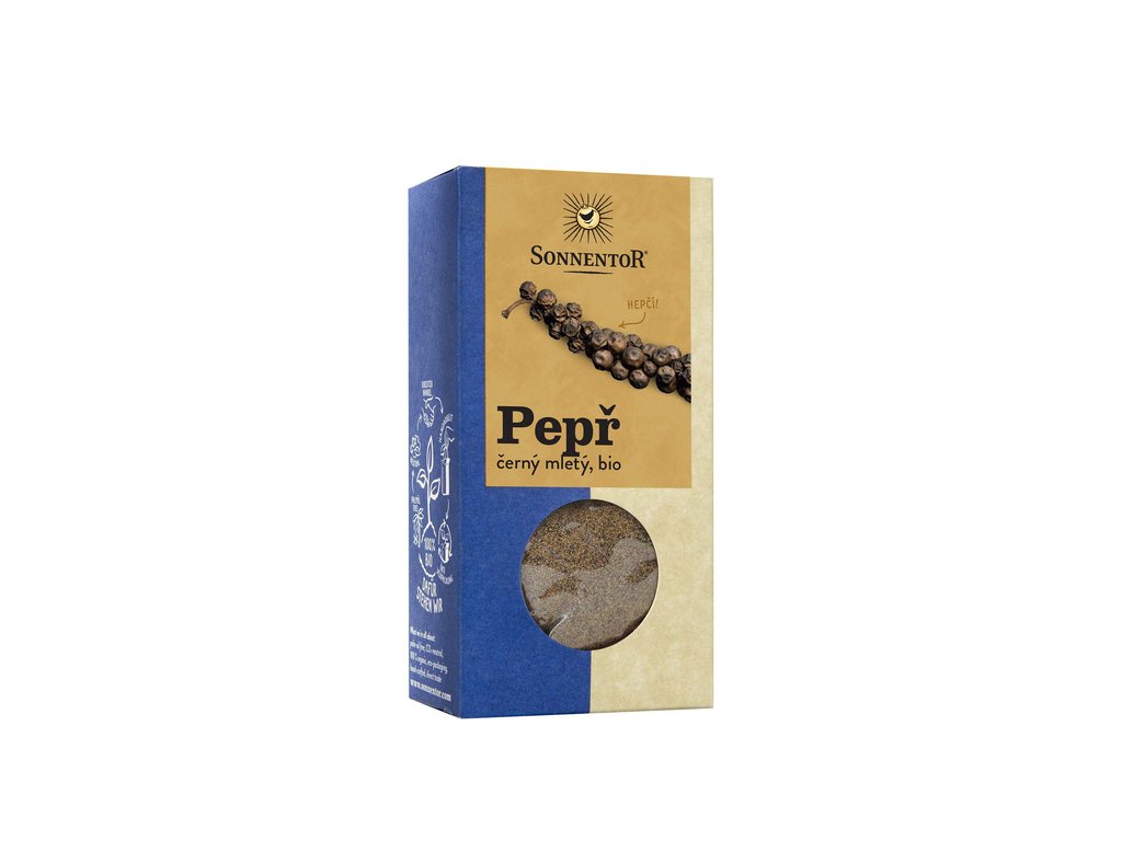 Pepř černý bio, mletý 50g od výrobce Sonnentor. Produkt v bio kvalitě. Pěstováno metodou ekologického zemědělství. Pepř je více než jenom kýchací prášek. Sušená neloupaná zrníčka semínek pepře mají jemnou ovocnou vůni a intenzivní ostrou pronikavou chuť. Ovoce se sklízí těsně před jeho úplným dozráním a poté se suší. Černý pepř je mnohostranně využitelný a používá se celý, drcený nebo čerstvě mletý. Zjemňuje a zostřuje jak pikantní, tak sladké pokrmy: saláty, dresingy, čerstvé těstoviny, maso, ryby i perník. Přesně víme, kde náš pepř roste. Pepř černý bio Skladovat v suchu a chladu. Tento produkt neobsahuje žádné alergeny.Doplňkové parametry