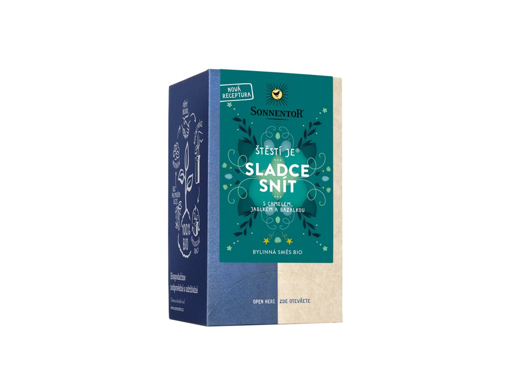 Štěstí je® sladce snít bio 27 g porc. dvoukomorový od výrobce Sonnentor. Produkt v bio kvalitě. Pěstováno metodou ekologického zemědělství. Tato harmonická čajová směs s chmelem, jablkem a bazalkou vás může příjemně ukolébat, jako v pohádce. Výtečně se hodí k salátům, těstovinám a lehčím pokrmům. Štěstí je... vydat se do říše snů a probudit se plný životního elánu. Prospěte se! 18 nálevových sáčků à 1,5 g Návod k přípravě: čajový sáček na šálek (cca 250 ml) přelejte vroucí vodou a nechte 5-10 min. luhovat. Zelený oves bio, Šalvěj bio, Saturejka bio, Meduňka bio, Chmel bio, Heřmánek bio, Lípa květ bio, Levandule bio, Fenykl bio, Máta peprná bio Skladovat v suchu a chladu. Tento produkt neobsahuje žádné alergeny.Doplňkové parametry