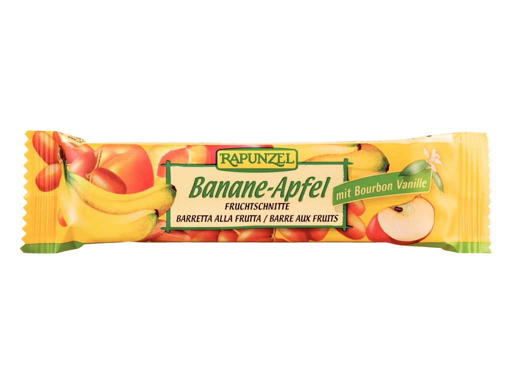 Bio tyčinka banán-jablko Tato výjimečná lisovaná banánovo jablečná tyčinka v oplatce je slazena pouze sušeným ovocem a medem a dochucená medovým marcipánem. Sladká chuť banánů a datlí velmi dobře doplňuje nakyslá chuť jablek. Díky kvalitním sacharidům a nízkému obsahu tuku je vhodná jako zdroj energie při sportování.