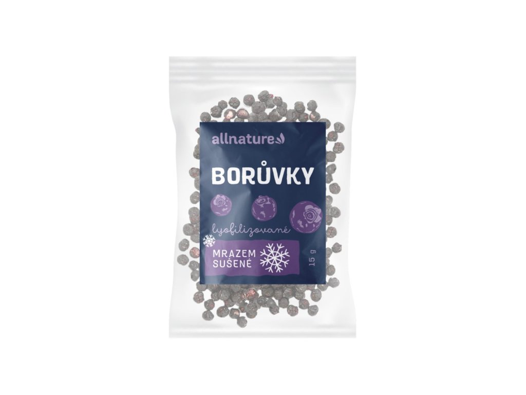 sušení ve vakuu, které borůvku zbaví 95 % vody. Lyofilizované borůvky Allnature