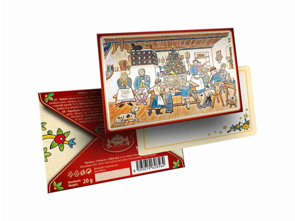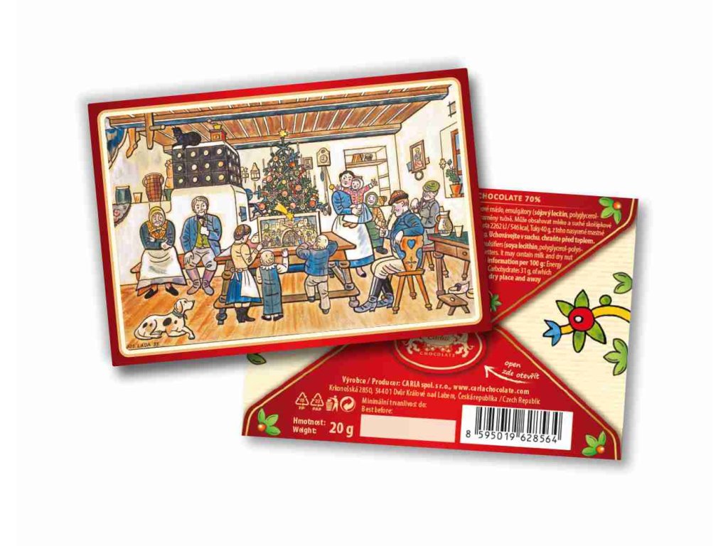 Česká čokoláda s motivem Josefa Lady bude krásnou pozorností i milým dárkem. Kvalitní hořká čokoláda vložená do malé obálky s motivem Josefa Lady a s kartičkou pro osobní vzkaz. Obálku lze darovat samostatně, vložit ji do dárkového koše či balíčku, ale také přidělat jako dekoraci na dárek.