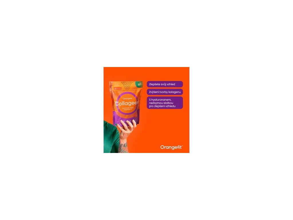 Collagen Booster Orangefit obsahuje unikátní kombinaci účinných látek - hyaluronanu, speciálně vybraných aminokyselin, vitamínů skupiny B, vitamínu C a zinku. Všechny tyto látky mají vlastnosti související s přirozenou produkcí kolagenu v těle.