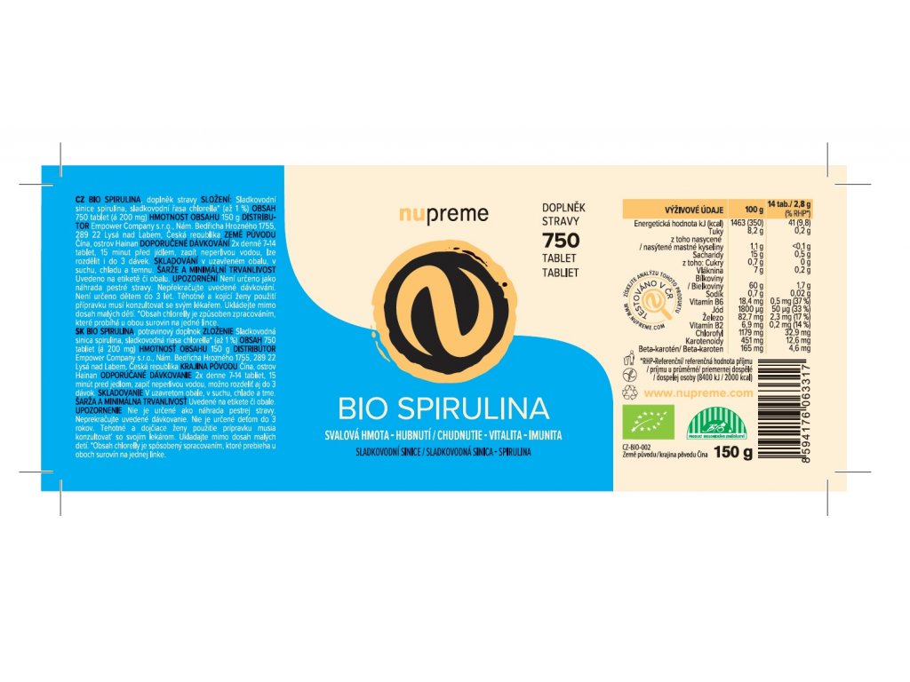 Bio Spirulina Organic NUPREME je přírodním zdrojem betakarotenu, vitamínů skupiny B, enzymů, železa, minerálů, chlorofylu, fykocyaninu, aminokyselin a dalších účinných látek. Je to silný antioxidant, který je posílený vysokým obsahem vitamínu B6 a železa. Spirulina neutralizuje škodlivé radikály a celkově podporuje vitalitu a normální činnost obranyschopnosti organismu.