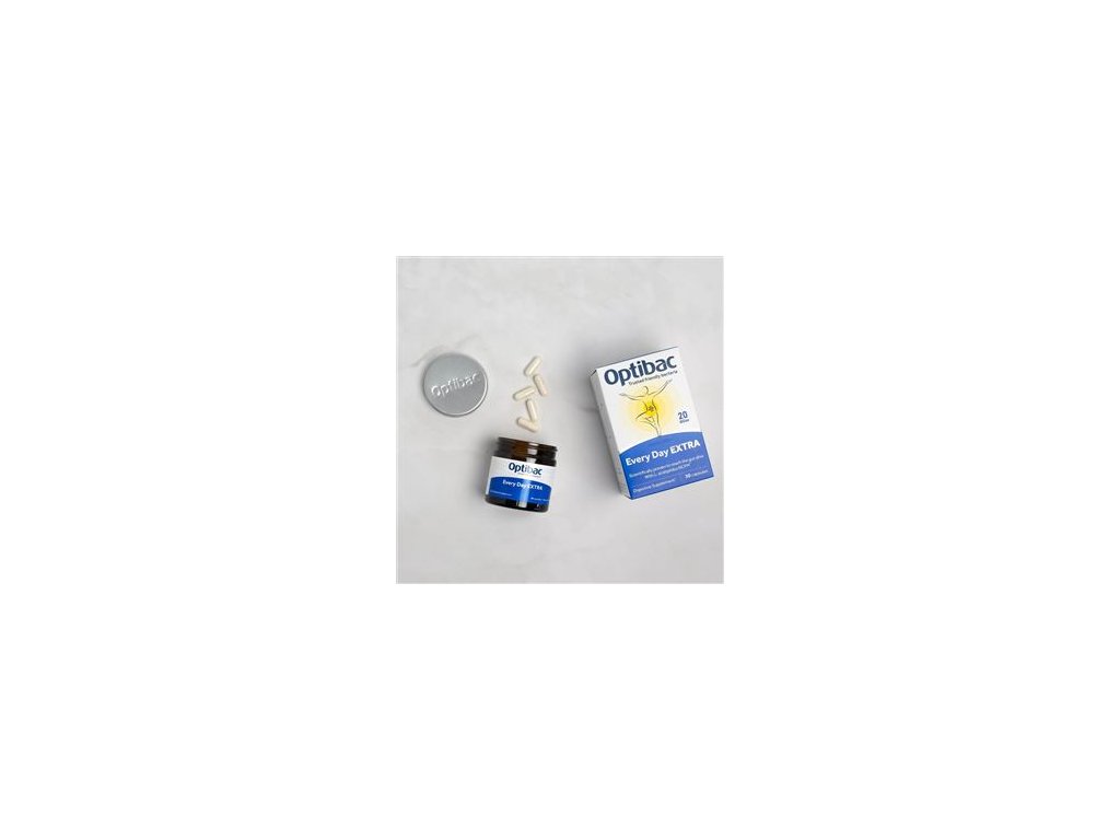 Optibac Every Day EXTRA je doplněk stravy s obsahem vysoké dávky komplexu vysoce kvalitních probiotik určeného pro každodenní podporu. Hodí se pro muže i ženy, lze jej užívat jako podporu obranného štítu, při vysoké zátěži, při rekonvalescenci, při užívání antibiotik nebo kdykoli, když cítíme, že náš zažívací trakt potřebuje pomoci. Every Day EXTRA obsahuje celkem 4 druhy probiotických kultur z kmenů Lactobacillus acidophillus NCFM®, Lactobacillus paracasei Lpc-37®, Bifidobacterium lactis BI-07®, Bifidobacterium lactis BI-04® v zesílené dávce - celkem 20 miliard v 1 kapsli. Proto se hodí pro podporu např. při náročné rekonvalescenci, při velkých obtížích apod. U všech obsažených probiotik byla ověřena schopnost projít kyselým prostředím žaludku a dostat se až do střeva.