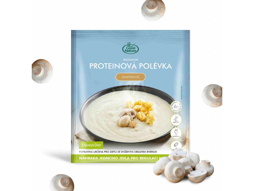 Žampionová polévka Express Diet vyniká vysokým obsahem proteinů a nízkým obsahem sacharidů, tuků a kalorií. Skvěle zahřeje a zasytí.