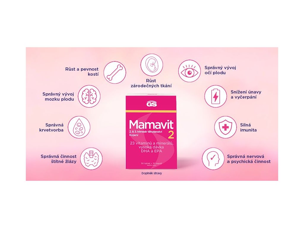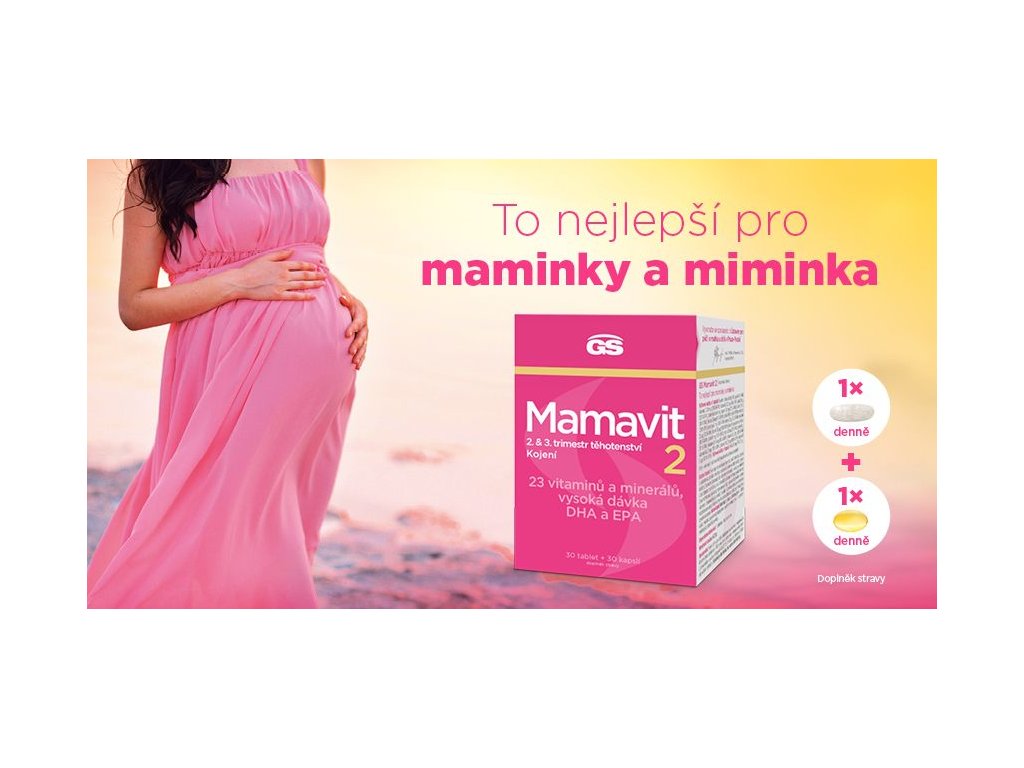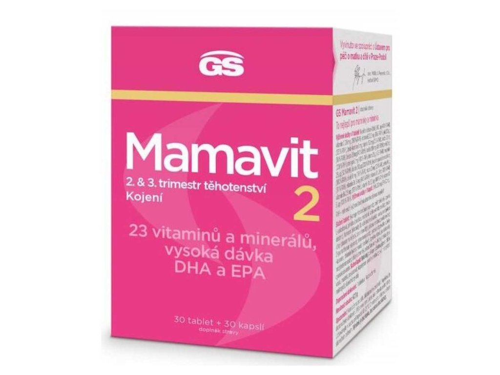 Výživový doplněk pro ženy těhotné a kojící maminky. GS Mamavit 2 obsahuje kompletní a vyváženou kombinaci 23 vitaminů a minerálů včetně vysoké dávky kyseliny listové v přirozené formě, hořčíku + DHA a EPA (omega-3 nenasycených mastných kyselin) a dalších důležitých látek. Díky speciální technologii jsou kapsle bez typického rybího zápachu. Toto složení bylo vyvinuto ve spolupráci s odborníky z Ústavu pro péči o matku a dítě v Praze-Podolí tak, aby vyhovovalo maminkám i miminkům ve všech důležitých obdobích.