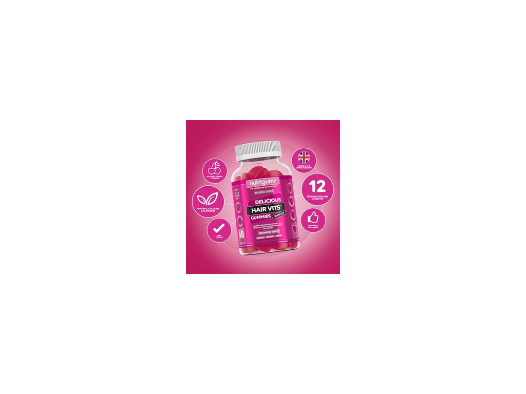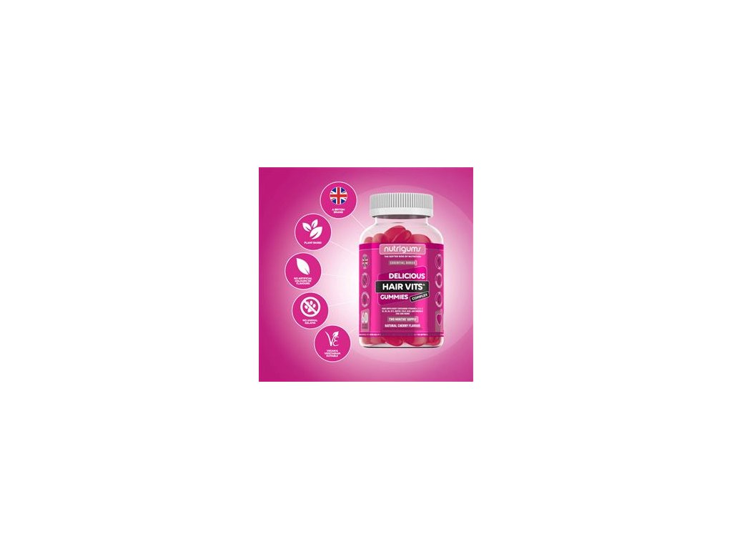 Vitamínová želé nemusí být plná umělých sladidel a barviv! Jde si pochutnat i bez syntetických látek. Želé Nutrigums® Hair Vits mají lahodnou přírodní třešnovou příchuť a lehce se konzumují. Tělu dodávají vitamín A, D, E, C, B6, B12, niacin, kyselinu listovou, biotin a kyselinu pantotenovou. Všechny tyto složky nabízí jedinečný účinek, který souvisí s optimální kvalitou vlasů, nehtú a pokožky.