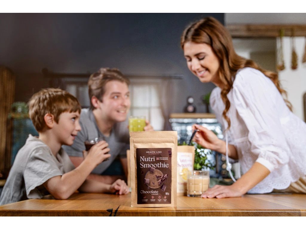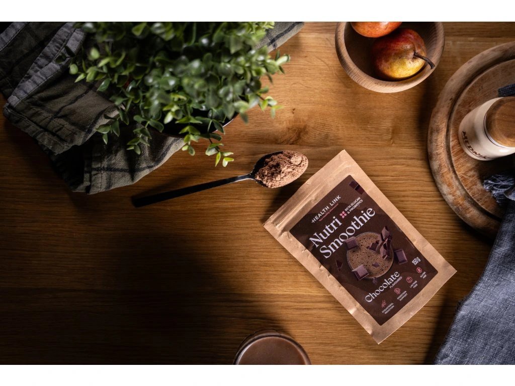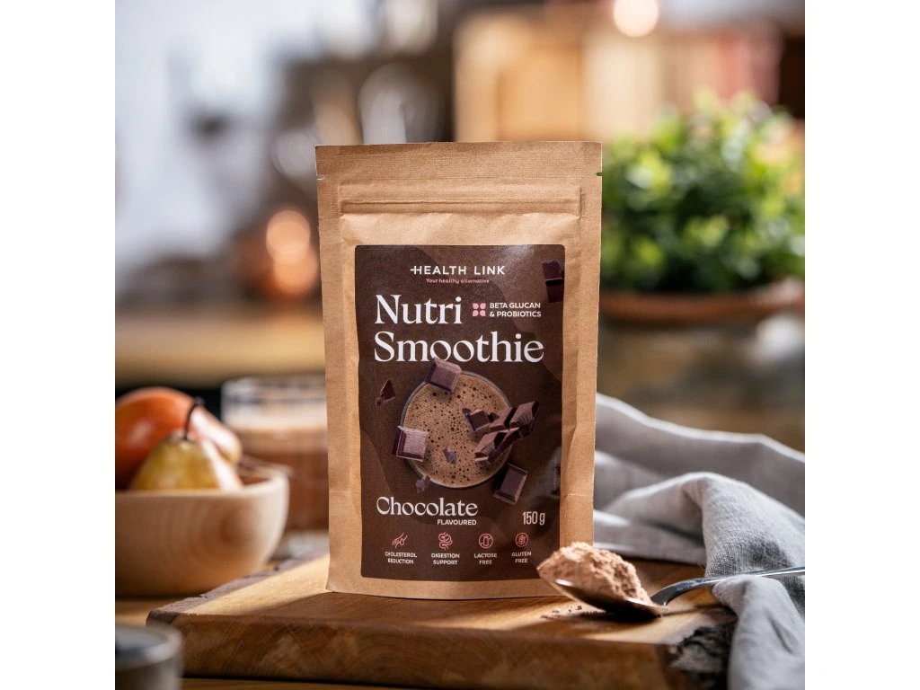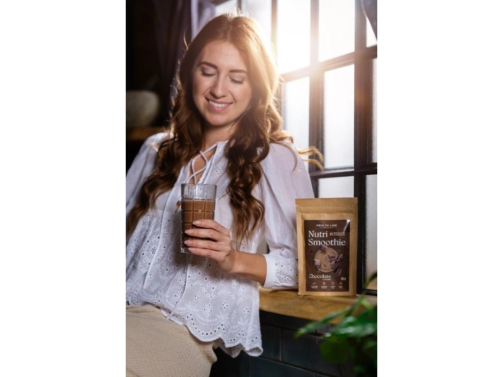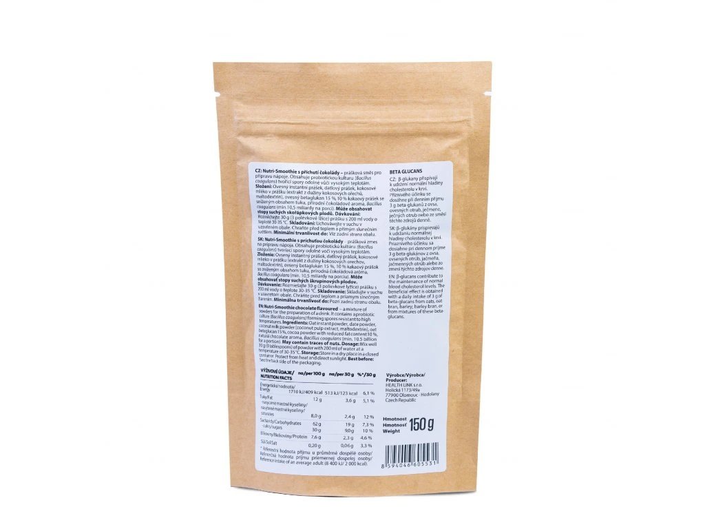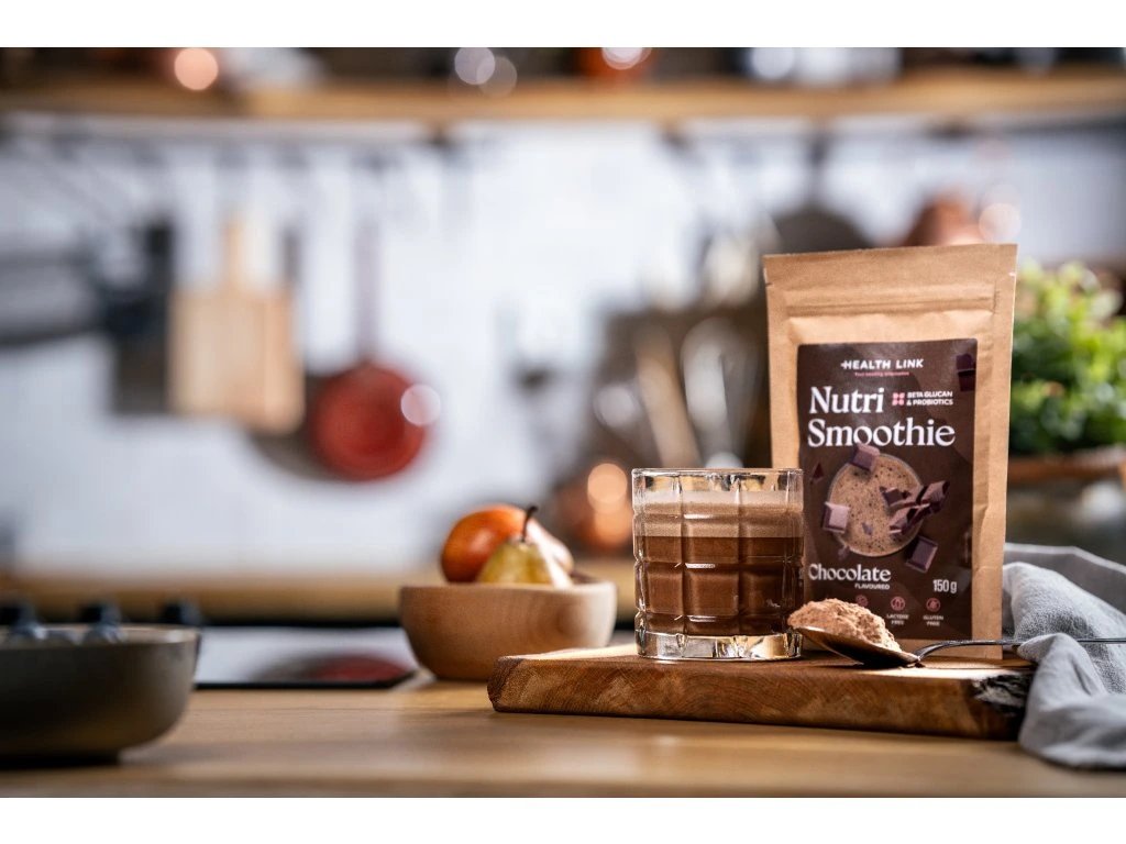 Nutri smoothie s příchutí čokolády, prášková směs pro přípravu nápoje. Obsahuje probiotickou strukturu tvořící spóry odolné vůči vysokým teplotám.
