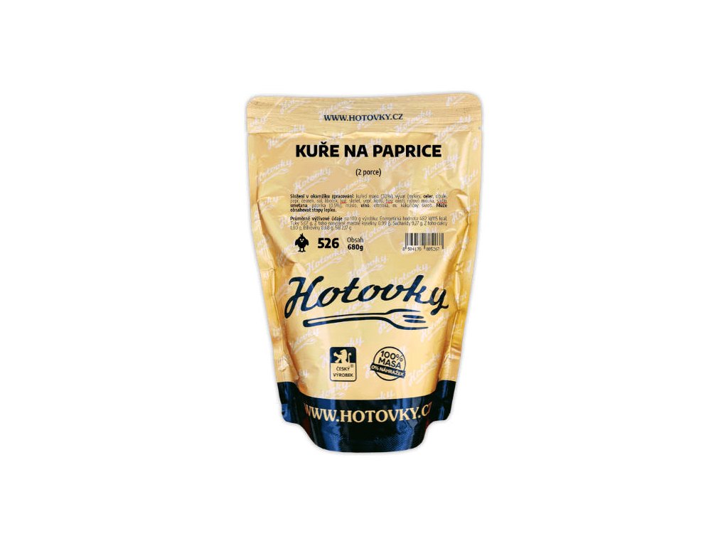 kuřecí maso (30%), vývar (mrkev, celer, cibule, pepř, česnek, sůl, libeček, kuř. skelet, vepř. kosti, hov. ořez), rýžová mouka, sádlo, smetana, paprika (0,5%), máslo, víno, citronka, m. kukuřičný škrob. Může obsahovat stopy lepku.