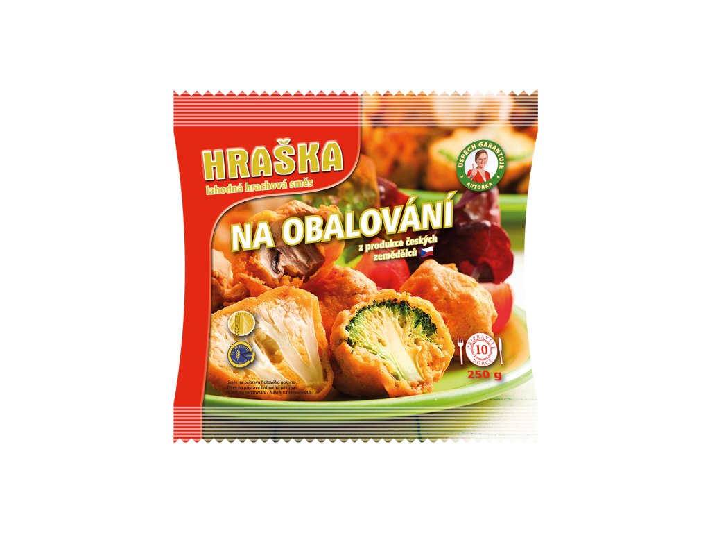Lahodná hrachová směs pikantní s chilli a česnekem. Lahodná, výživná obalovací směs hrachu a bezlepkových obilovin, která umožňuje rychlé a zdravé obalování bez použití vajec. Těstičko z Hrašky dobře drží, neodpadává, skvěle chutná a i přesto, že jej smažíme je velmi zdravé! Hrách samotný je velmi sytnou potravinou s vyšším obsahem bílkovin a nižším obsahem sacharidů oproti brambor. Hrách obsahuje vitamíny skupiny B, draslík, železo, hořčík i zinek. Hrách v kombinaci s obilovinami a zeleninou jsou perfektním, plnohodnotným (převážně na bílkoviny) pokrmem vegetariánu, veganů, diabetiků, celiaků a osob vyznávající zdravý životní styl.