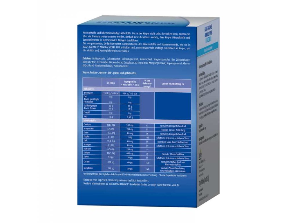 Minerály jsou životně důležité živiny. Protože si je tělo nedokáže vyrobit samostatně, musí být absorbovány potravou. Proto je zvláště důležité dodávat tělu dostatečné množství minerálních látek a stopových prvků. Vyvážené, vhodné kombinace minerálů a stopových prvků obsažené v BASIS BALANCE® MINERALS PUR podporují mnoho důležitých funkcí v těle za účelem udržení vitality a rovnováhy.
