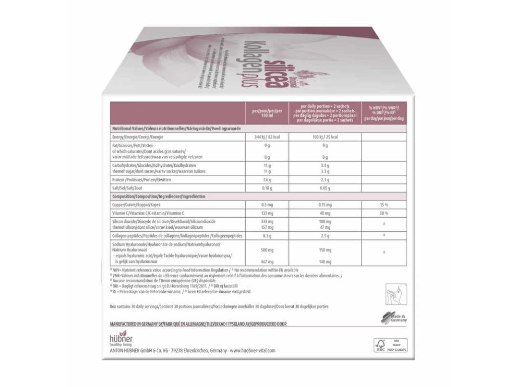 Hübner Original Silicea® Kollagenplus je speciálně vyvážená kombinace vysoce kvalitních kolagenních peptidů (Verisol®), kyseliny hyaluronové Haplex® Plus**, unikátního silicea silikagelu, vitamínu C a stopového prvku mědi.