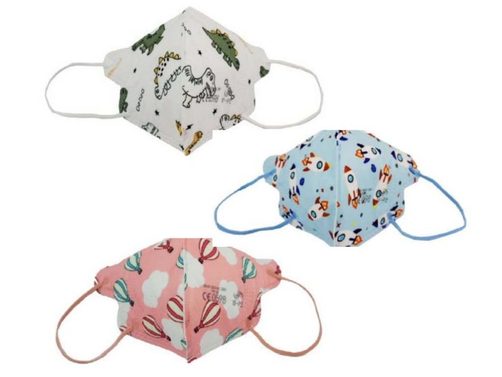 Respirátor s dětským vzorem FFP2 s filtračním efektem min. 95% bránící průniku mikroorganismů (bakterie, viry, spory plísní), jemného prachu a toxických tuhých či kapalných částic zvenku dovnitř a tím chrání dýchací ústrojí uživatele.