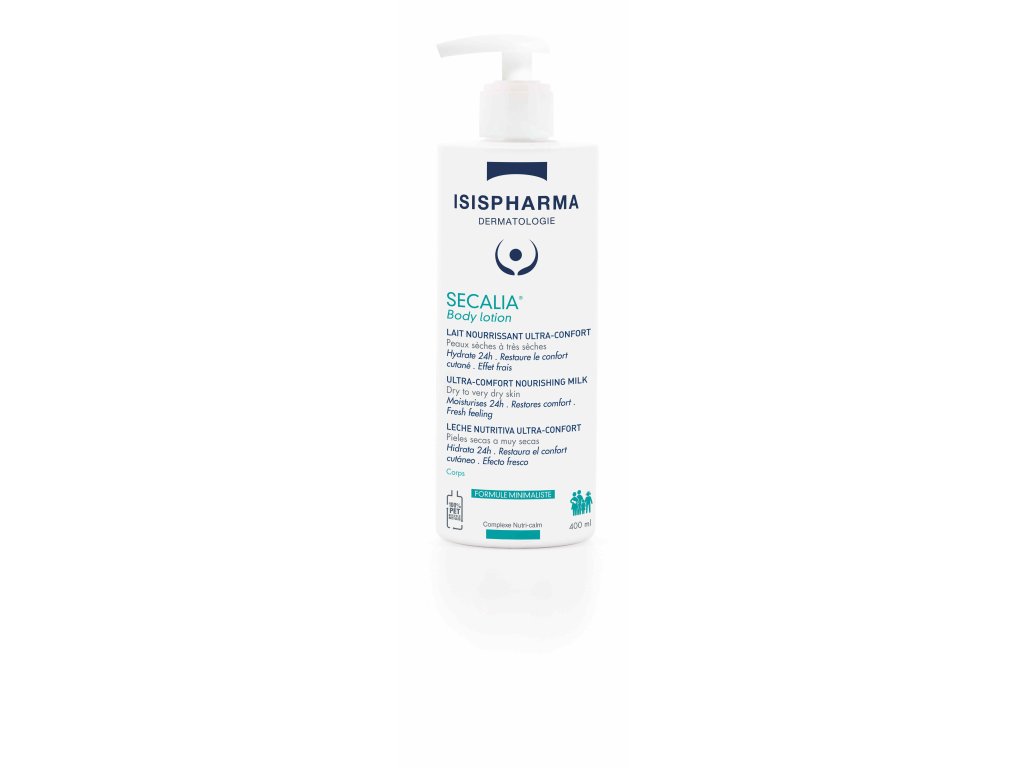 ISISPHARMA SECALIA Body Lotion je výživné tělové mléko určené pro suchou až velmi suchou pokožku. Jeho lehká, fluidní textura se snadno roztírá a aktivní látky se rychle vstřebávají, čímž obnovují celkový komfort pokožky. Komplex Nutri-calm® poskytuje výživu a hydrataci po dobu až 24 hodin. Toto mléko má minimalistické složení bez parfemace, které zaručuje vysokou snášenlivost.