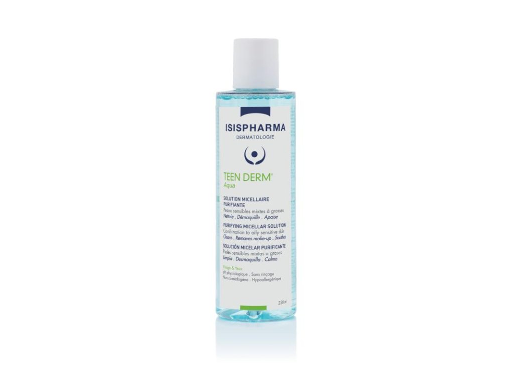 Odličovací micelární voda ISISPHARMA TEEN DERM Aqua jemně odstraňuje make-up a každodenní nečistoty, aby obnovila svěží a zářivý vzhled pleti. Přípravek s fyziologickým pH čistí pleť, aniž by narušoval její rovnováhu. Obsahuje přídavek avokádového oleje, zklidňující výtažek z boswelie + zinek a měď, které omezují množení bakterií.
