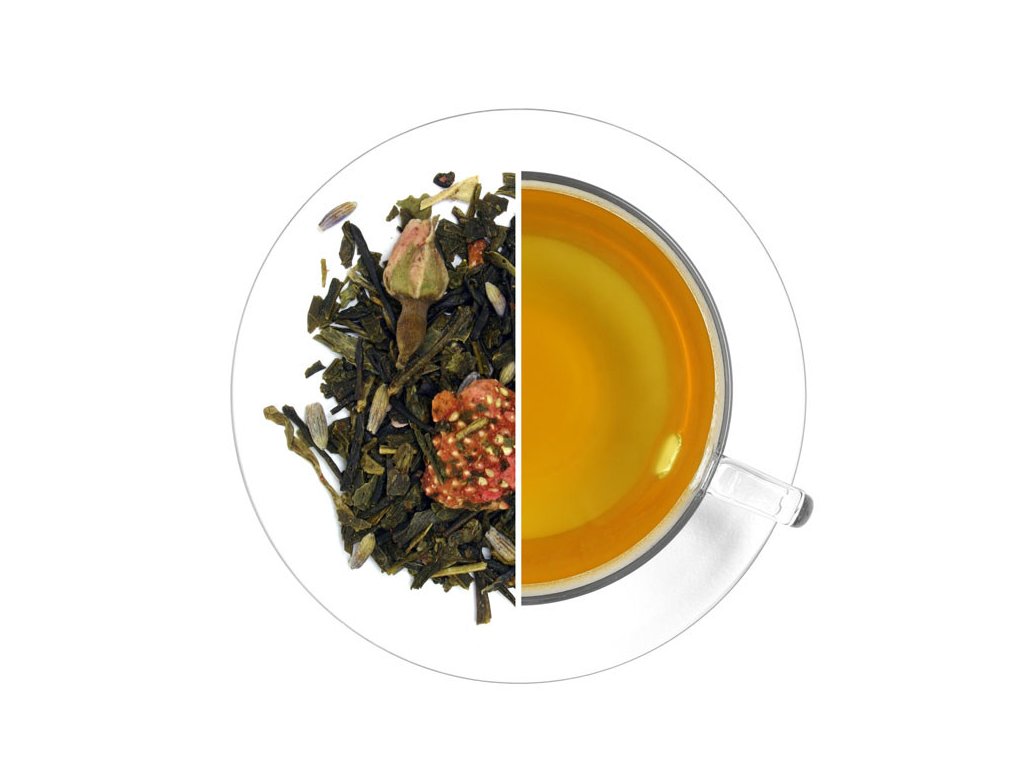 Jahoda v šampaňském - Příprava: Vodou o teplotě 70-80°C zalejte čaj v poměru 1,5 dl na 1 čajovou lžičku. Pokud čaj louhujete v konvici, pak navíc 1 lžičku na konvici. Ponechte 2-3 minuty louhovat. Poté přeceďte.Složení: pravý zelený čaj Sencha, rozinky (rozinky, slunečnicový olej), jahody (min.6,1%), poupata růží, aroma, levandule, aroma šampaňského (min.0,5%). Může obsahovat stopy suchých skořápkových plodů