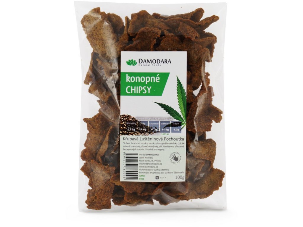 Chipsy s konopným semínkem Damodara - chipsy jsou zdravé luštěninové křupky vhodné taktéž pro vegany. Neobsahují žádné živočišné produkty ani jakékoliv přísady vyrobené za použití živočišných produktů, naopak jsou luštěniny výborným zdrojem rostlinných bílkovin. Bez konzervantů, umělých barviv, emulgátorů, ochucovadel či jiných umělých složek. Jsou vyrobeny výhradně z čistě přírodních surovin z přirozeně bezlepkových surovin.Složení: Hrachová mouka, mouka z konopných semínek (16,8%), sušené brambory, sluneč. olej, mořská sůl.