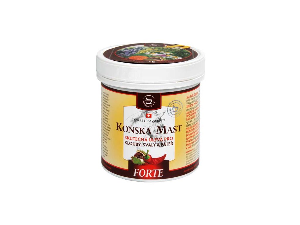 Koňská mast Forte je vyrobena podle tradiční, generacemi prověřené receptury s vysokým obsahem extraktů plodů kaštanu koňského, kostivalu, rozmarýnu, arniky a je obohacena o množství rostlinných bioaktivních látek dle poznatků moderní vědy. Vyvážený obsah těchto substancí zaručuje široký a silný účinek. Kombinuje uvolňující účinky silic s příznivým působením výtažků z bylin. Balzám rychle vyvolává intenzivní osvěžení a prokrvení, čímž zvyšuje působení účinných látek a tím urychluje rekonvalescenci.