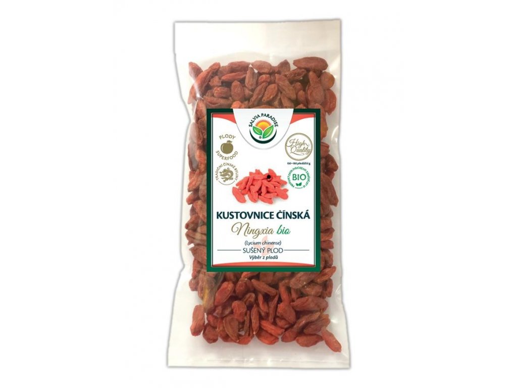 Salvia Paradise® je přímým dovozcem BIO goji z čínské oblasti Ningxia, oblasti plodící nejkvalitnější goji na světě.Top kvalita goji 150–180/50 znamená, že 50 g kustovnice obsahuje v průměru 150–180 plodů. Jedná se o nejlepší kvalitu goji, jakou lze v Ningxii zakoupit.