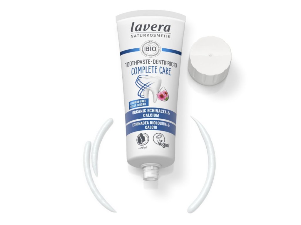 Nové vylepšené složení lavera Complete Care zubní pasty bez fluoridu pečuje o dásně a obnovuje zubní sklovinu. Snižuje riziko vzniku zubních kazů i zubního kamene. Protože neobsahuje fluorid sodný ani oxid titaničitý, je vhodná pro děti a osoby s citlivými dásněmi. Výtažky z Bio Echinacey, Bio Lékořice a Bio Měsíčku posilují dásně a zklidňují drobná podráždění v dutině ústní. Díky tomu, že pasta neobsahuje fluorid sodný, je možné ji používat i při užívání homeopatických přípravků.