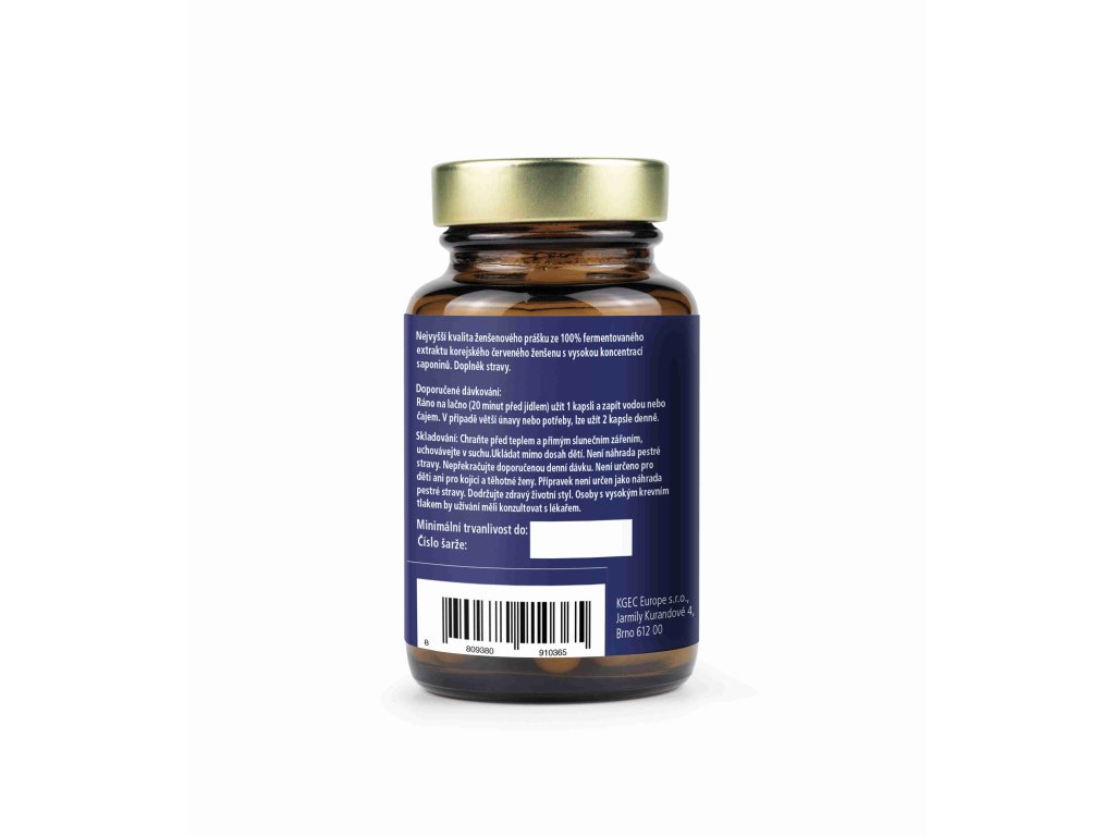 Korejský ženšen je ze všech druhů ženšenu nejúčinnější, a to díky obsahu 34 druhů účinných látek saponinů (ginsenosidů). Při enzymem ošetřeném zpracování (fermentace) dochází k účinnějšímu vstřebávání aktivních látek a kapsle jsou tak vhodné i pro jedince s poruchami trávení a starší osoby. Díky snadnému užívání je může brát každý včetně vegetariánů. Želatinový obal kapsle snadno otevřete a vysypete. Jedná se o produkt označený ochrannou známkou Korea INSAM udílenou korejským Ministerstvem zemědělství prověřeným ženšenovým produktům.