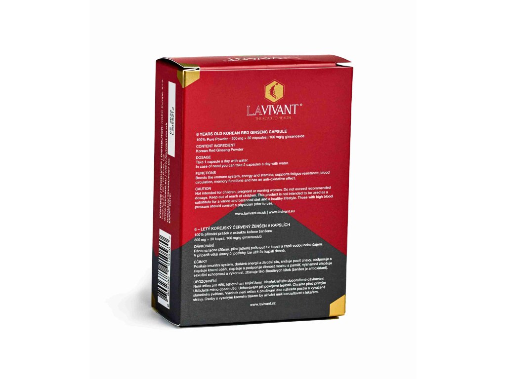Kapsle LAVIVANT VEGAN, obsahují vysokou kvalitu ženšenového prášku, který je vyroben z kořene korejského šestiletého červeného ženšenu a dosahuje koncentrace saponinů (ginsenosidů) 100mg/g a a z toho Rg1, Rb1 a Rg3 celkem více než 10 mg/g. V případě prevence stačí užívat 1 x kapsli denně. Při potížích, pooperačních stavech, po antibiotikách doporučujeme až 3 x kapsle denně po dobu dvou až tří týdnů.