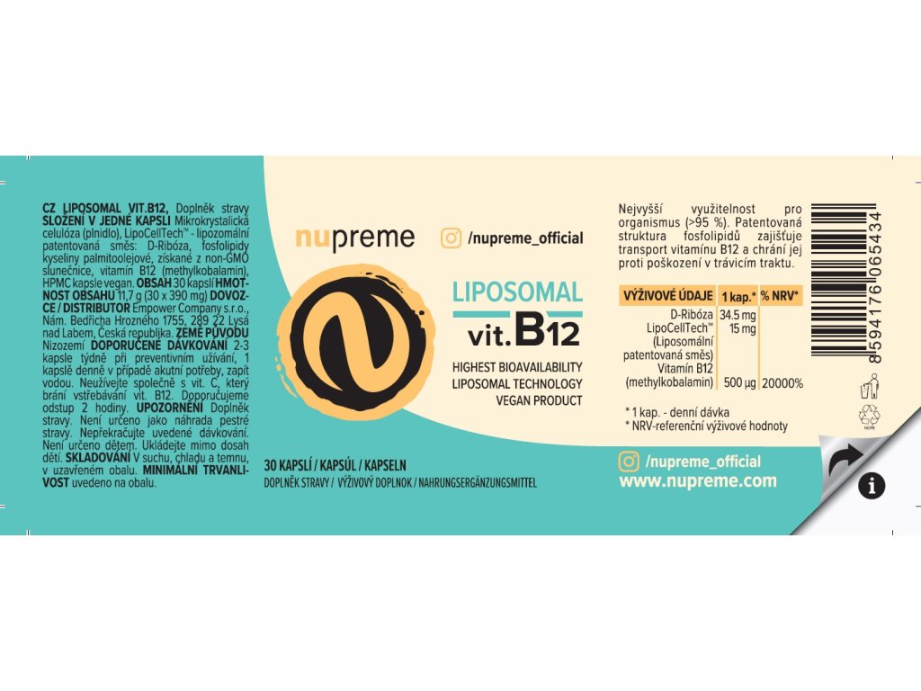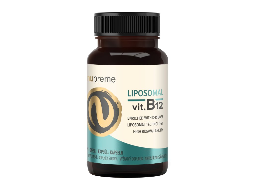 LIPOSOMAL VIT. B12 NUPREME, doplněk stravy, zajišťuje s každou kapslí 20 000 % denní dávky vitaminu B12. A to už je pořádná porce energie – pro náročné dny plné stresu, pro boj s dotěrnými viry a bakteriemi a v neposlední řadě pro pohodové zvládání každodenních výzev v práci i doma.
