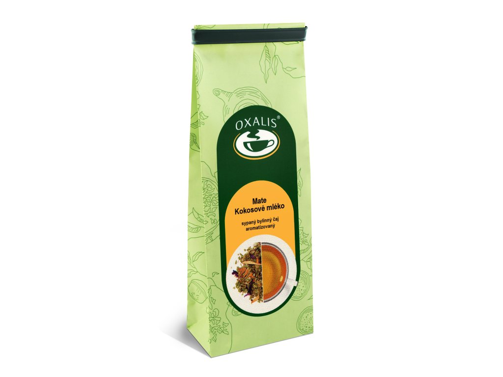 Mate Kokosové mléko Velmi oblíbený jihoamerický nápoj. Je známý pro svůj povzbuzující účinek – obsahuje kofein, ale i jiné důležité minerální látky. Příprava: 1 lžička na šálek 1,5 dl, voda o teplotě 80 °C, 3-5 min louhování.Složení: mate (min.85%), kokos (min.5,3%), aroma, čokoláda (rostlinný tuk,odstředěné mléko, laktóza, emulgátor sojový lecitin, látky určené k aromatizaci, glukózový sirup, leštící látka šelak), heřmánek římský, bambusové výhonky.