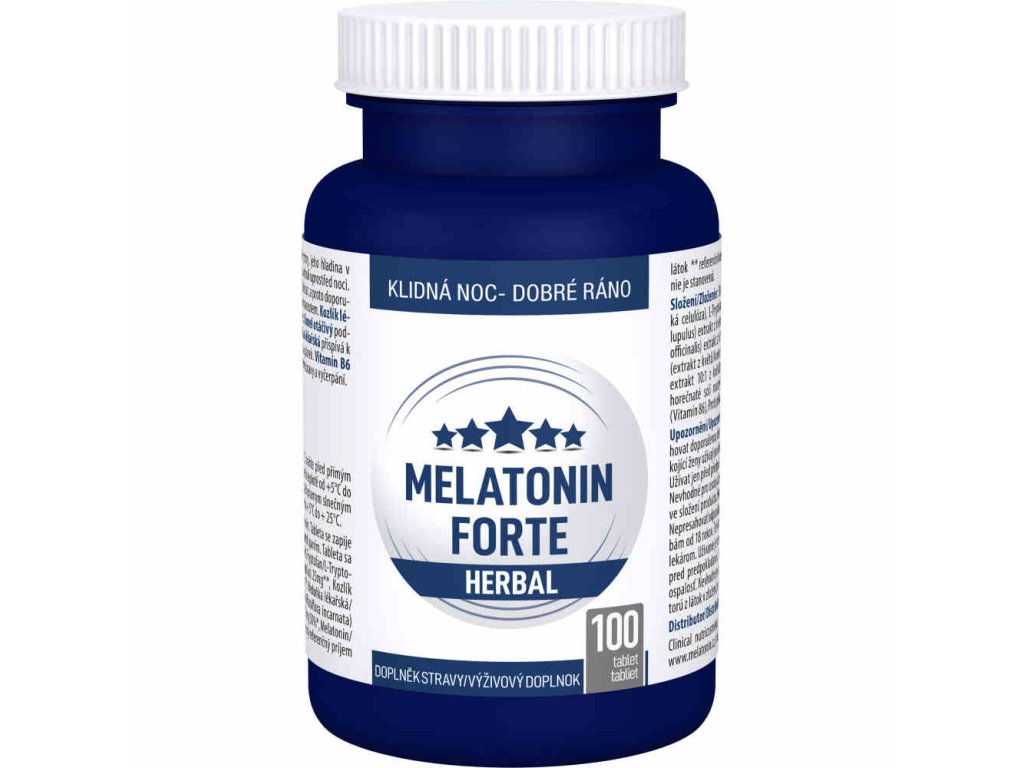Clinical Melatonin FORTE Herbal obsahuje extrakty z bylinek, které napomáhají uvolnění a klidnému spánku + melatonin, L-tryptofan a vitamin B6. Melatonin je látka, která se přirozeně tvoří v našem těle a podporuje usínání. Tryptofan a vitamin B6 se podílejí na tvorbě serotoninu a spánkového hormonu melatoninu. Obsažená meduňka, mučenka, chmel a kozlík lékařský mají zklidňující a relaxační účinky.