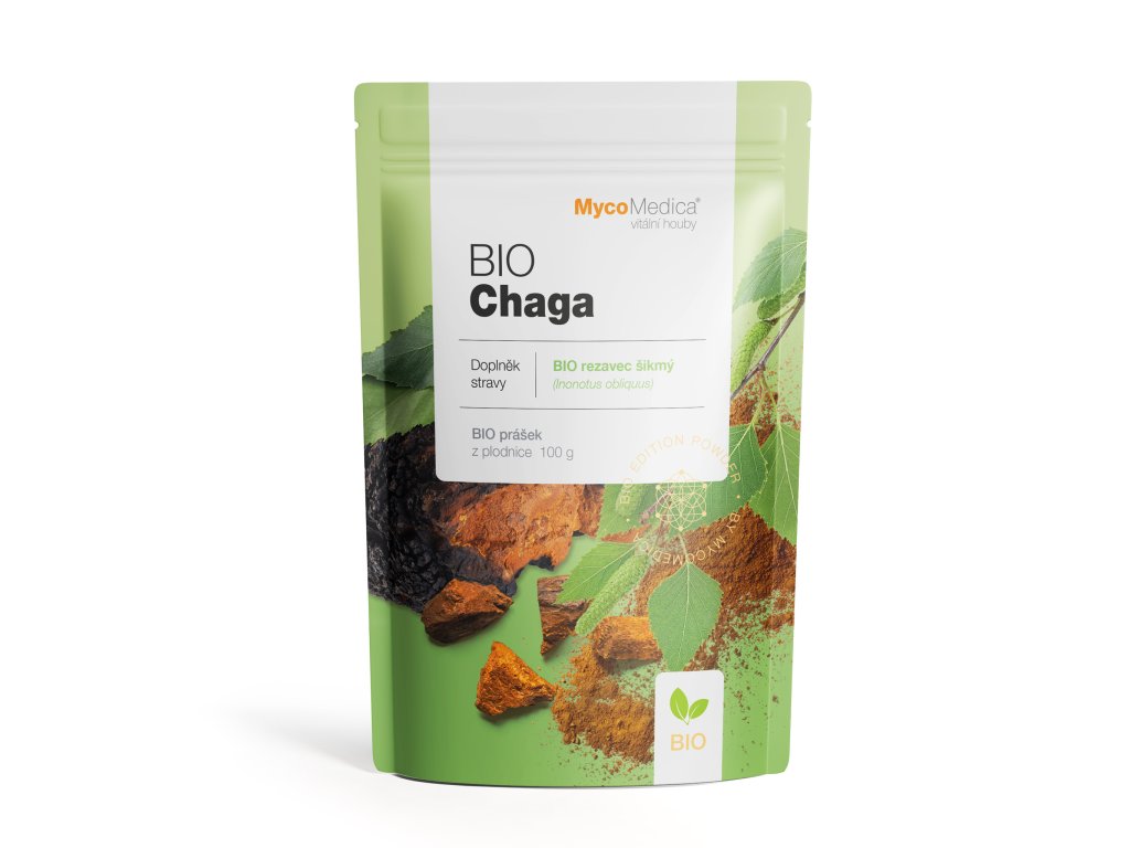 Chaga (rezavec šikmý, Inonotus obliquus) roste hlavně na břízách východní Evropy, ruské Sibiře a severních oblastí Číny. Obyvatelé Sibiře z ní vaří odvary k léčbě nádorů a nazývají ji „Dar od boha“. Chaga (rezavec šikmý, Inonotus obliquus, Kabanoanatake) je dřevokazná chorošovitá houba, která roste hlavně na břízách. Vytváří nejprve víceleté až 35centimetrové plodnice až později, když strom odumírá a podhoubí se dostalo hluboko pod kůru, se tvoří dokonalé plodnice. Pochází z oblasti Ruska a Sibiře, běžně se s ní setkáváme i na severu Polska aj. Chaga je součástí tradiční ruské medicíny již několik století. Nejvíce ji využívá lid Khanty, pro který je velmi cenná a ceněná. Chaga je bohatá na velké množství bioaktivních látek, krom vitamínů a minerálů obsahuje i melanin, díky němuž je tmavý, triterpenové sloučeniny betulin a kyselinu betulinovou, které získává ze svého hostitele břízy, obliquol, dále pak v něm můžeme najít velmi důležité polysacharidy – beta glukany, flavonoidy, steroly či pteridin. Jako surovinu používáme Chagu, která roste divoce na břízách v oblastech severní Číny (provincie Hei Long Jiang) a východní Sibiře, kde je příroda člověkem prakticky nedotčená.