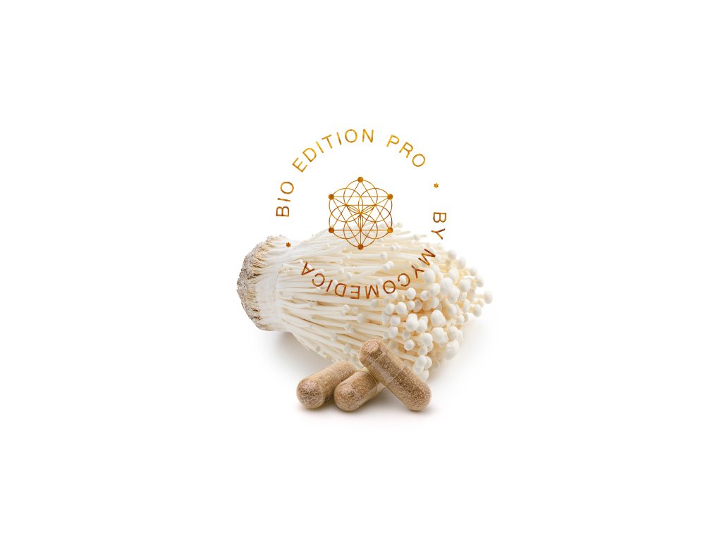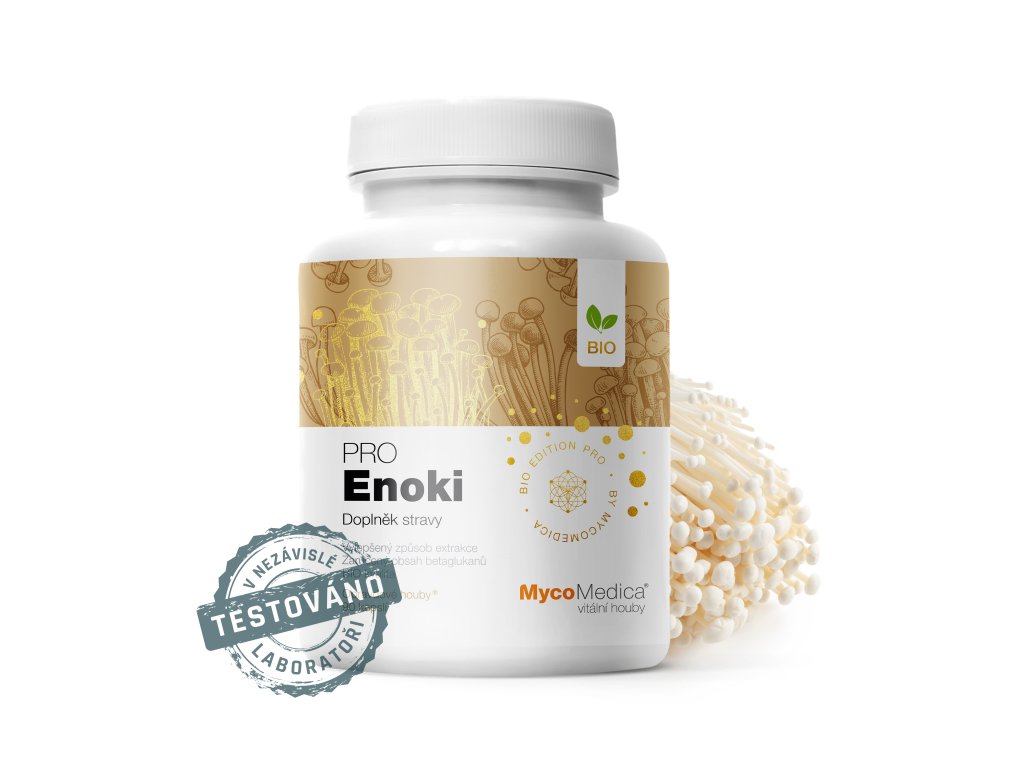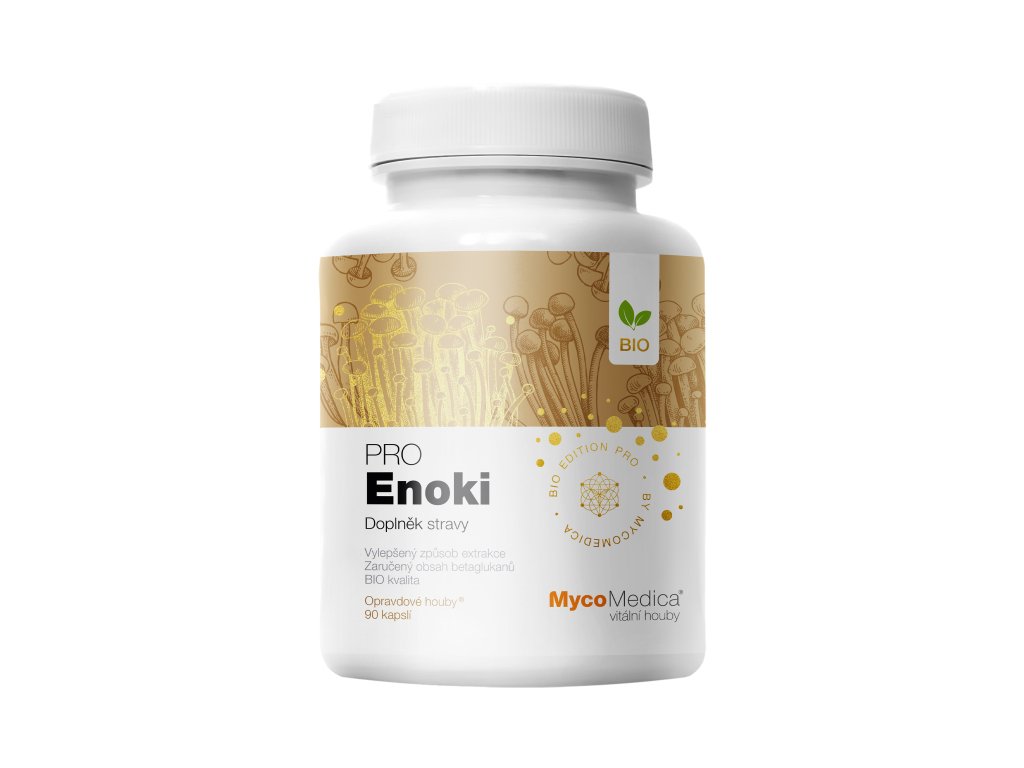 500 mg BIO Enoki (penízovka sametonohá, Flammulina velutipes) – kombinovaná extrakce z plodnice, min. 30 % beta 1,3/1,6 D-glukanů (100% čistý extrakt).