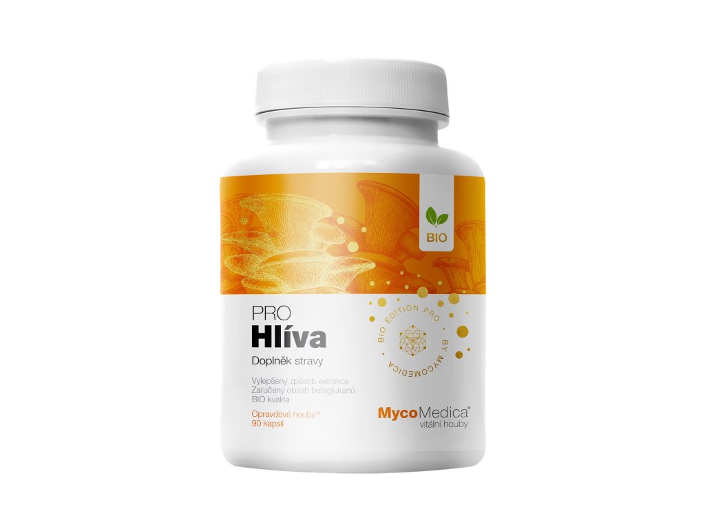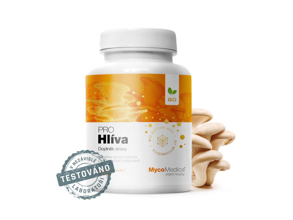 500 mg BIO Hlíva (hlíva ústřičná, Pleurotus ostreatus) – kombinovaná extrakce z plodnice, min. 30 % beta 1,3/1,6 D-glukanů (100% čistý extrakt).
