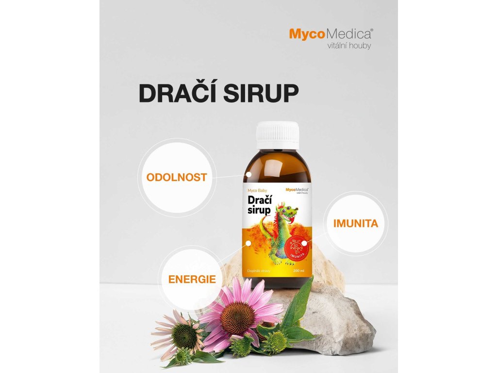 Díky kombinaci polysacharidů vitálních hub a extraktů z bylinek působí MycoBaby dračí sirup výrazně na posílení obranyschopnosti těla. Jelikož vitální houby jsou poměrně chuťově výrazné, je do sirupu přidáno vysoce kvalitní holandské kakao, což činí sirup lahodným. Díky svým účinkům je sirup vhodný nejen pro děti, ale i pro dospělé.