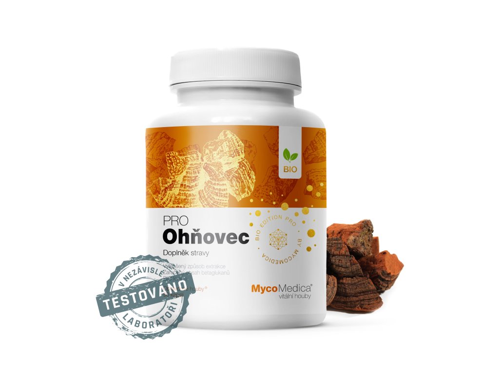 500 mg BIO Ohňovec (ohňovec brázditý, Phellinus linteus) – kombinovaná extrakce z plodnice, min. 30 % beta 1,3/1,6 D-glukanů (100% čistý extrakt).