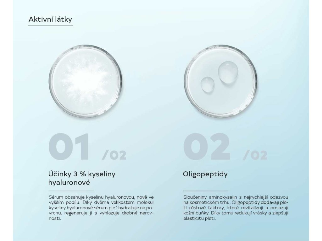 3% koncentrace kyseliny hyaluronové intenzivně hydratuje ve všech vrstvách pokožky a zabraňuje tvorbě vrásek v bodě jejich vzniku. Oligopeptidy dodávají pleti růstové hormony, které revitalizují a omlazují kožní buňky. Díky tomu redukují vrásky a zlepšují elasticitu pleti. Jde o typy peptidů s nejrychlejší odezvou na kosmetickém trhu.